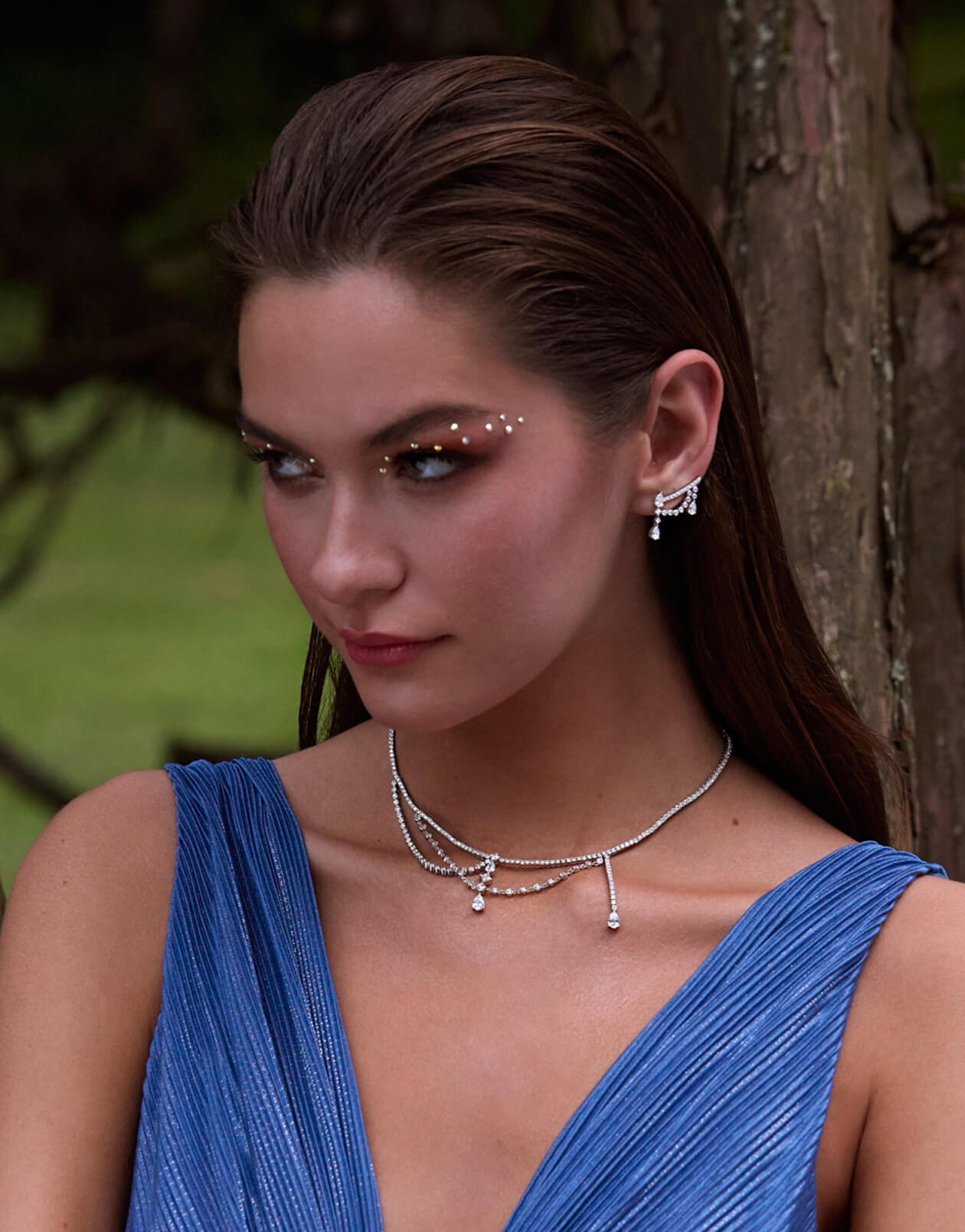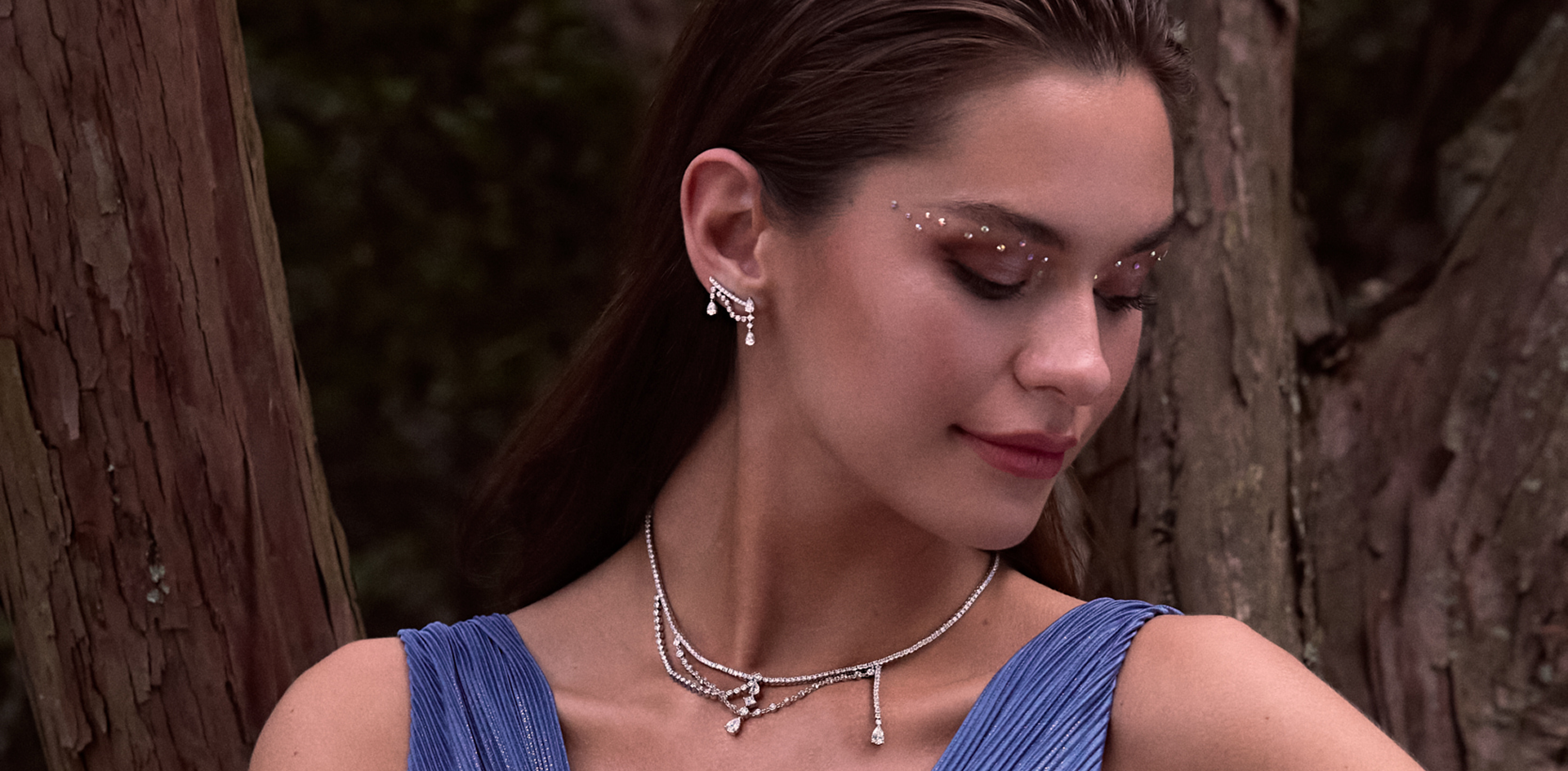 The designs within the Goddess Collection flow with effortless grace. Draped in delicate 18k gold, they feature brilliant round, princess, and pear shape diamonds, each piece shining with divinity — elegant, fluid, and made for you, the modern muse.