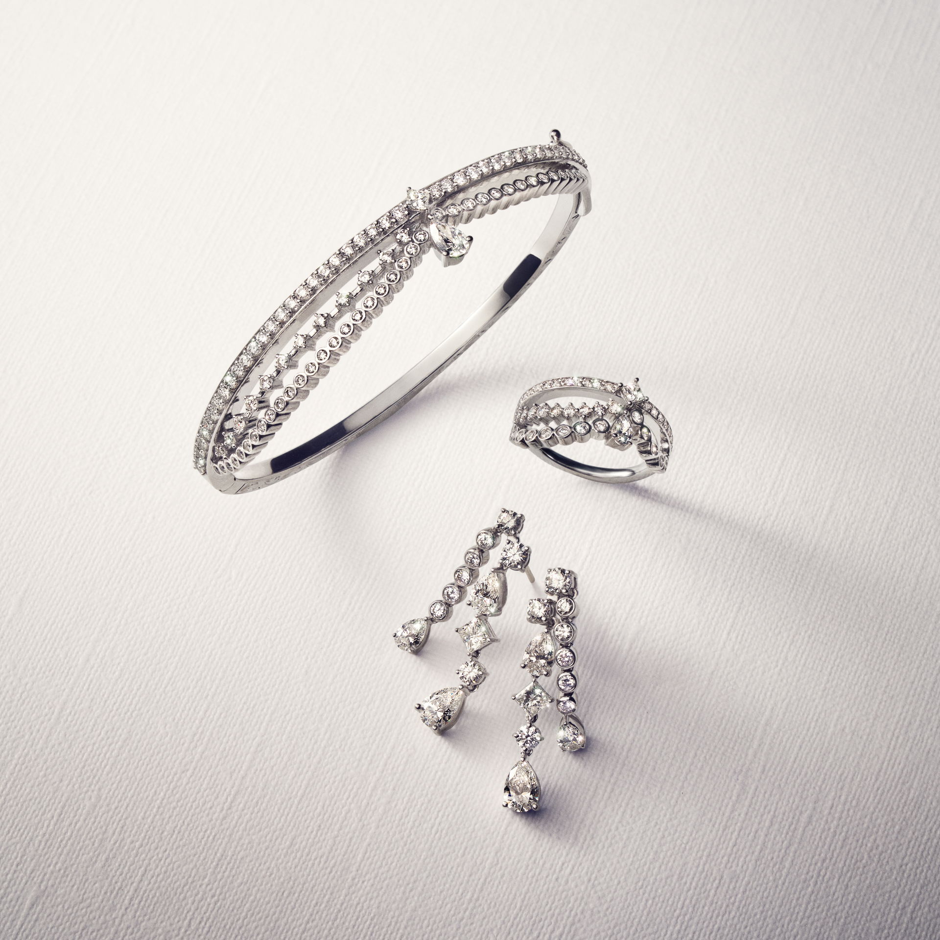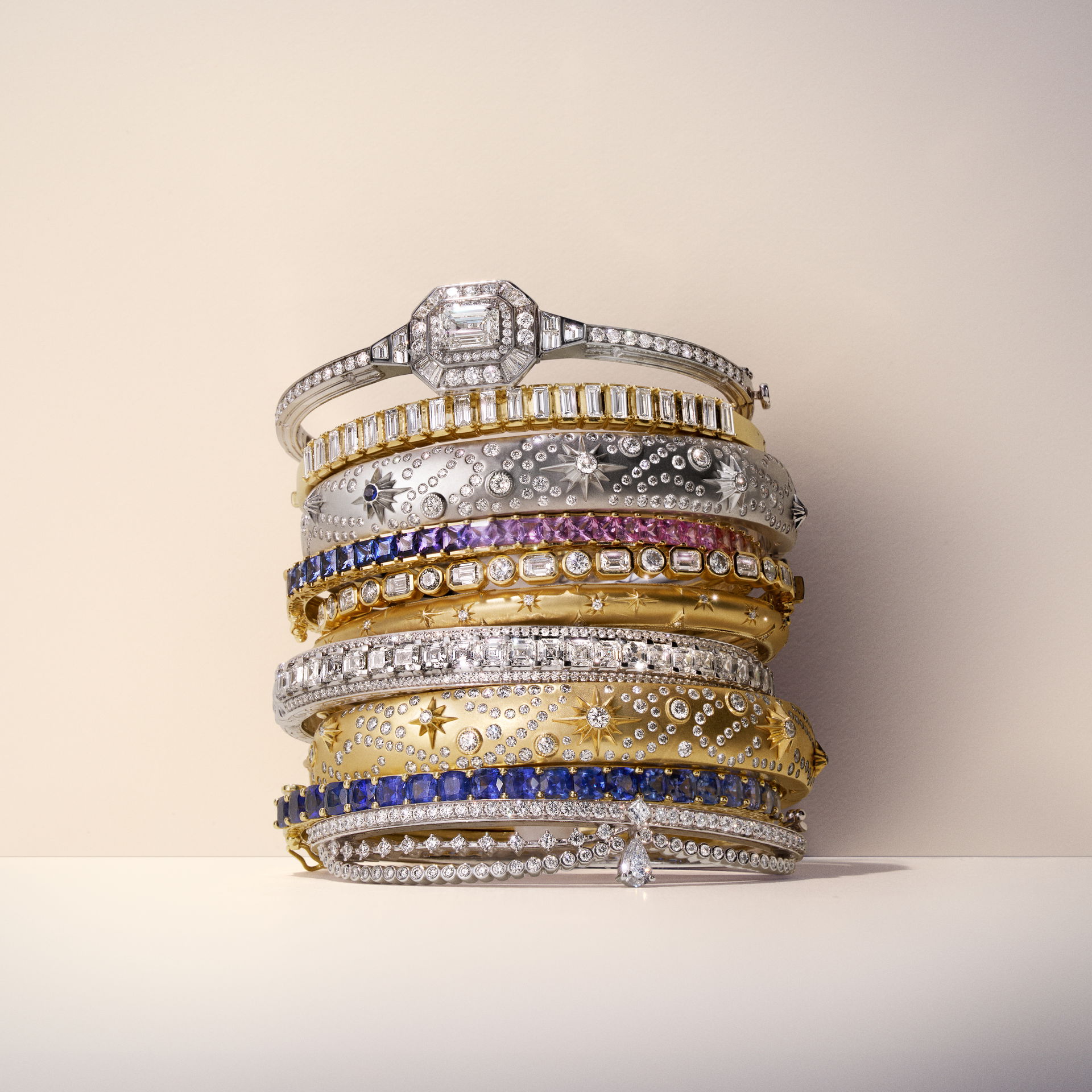 Handcrafted in 18K gold, this bangle is adorned with 1.93 ctw of diamonds — including .33 ct pear shape, .09 ct princess cut, and 1.51 ct round brilliant stones — arranged in a rhythmic pattern that honors the movement of light and form.