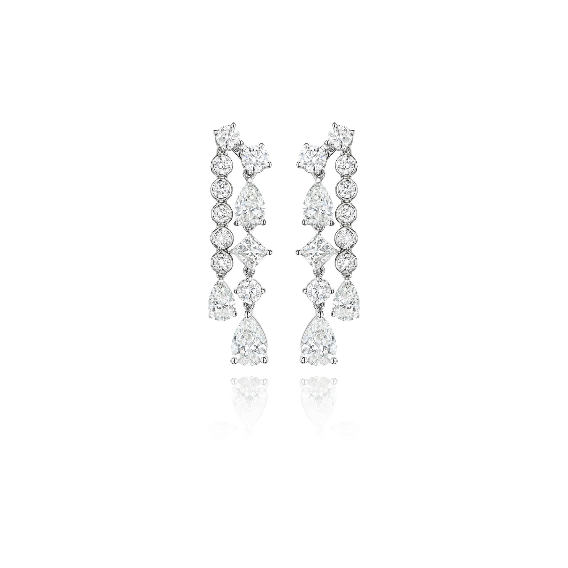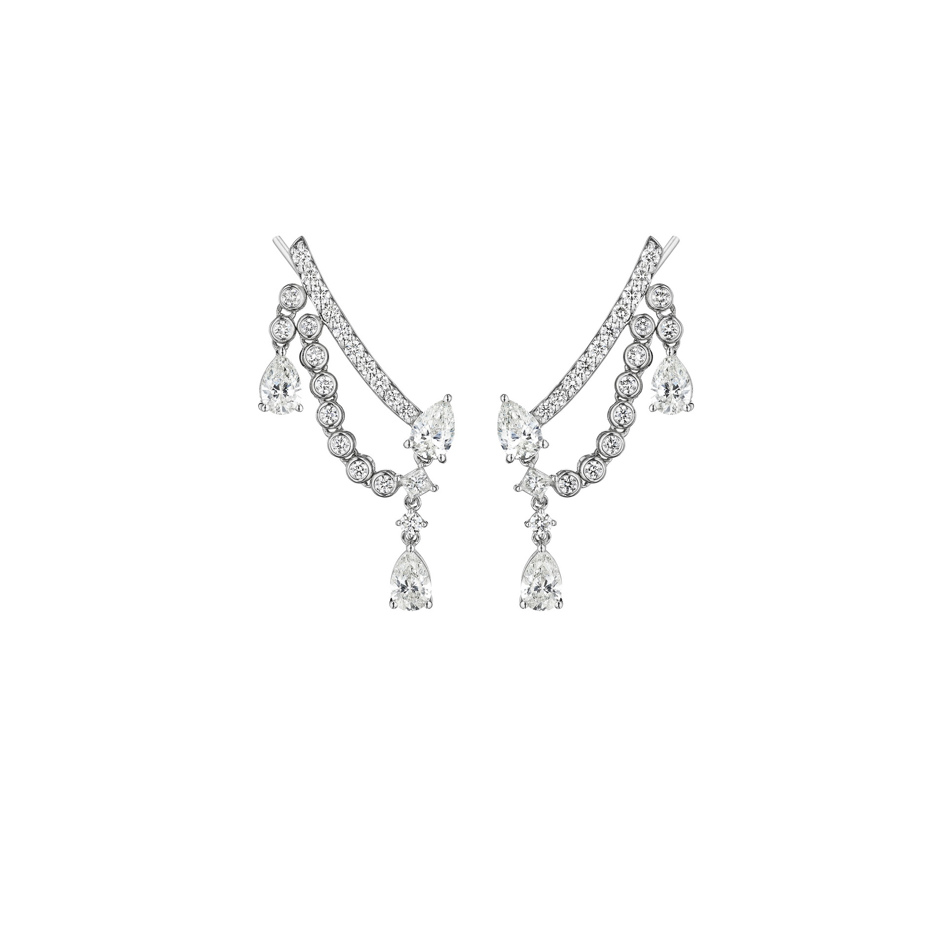 These 18K gold ear climbers radiate with 1.98 ctw of diamonds — 1.30ct pear shape, .10ct princess cut and .58 ct round brilliant — arranged to trace the curve of the ear like a trail of starlight.
