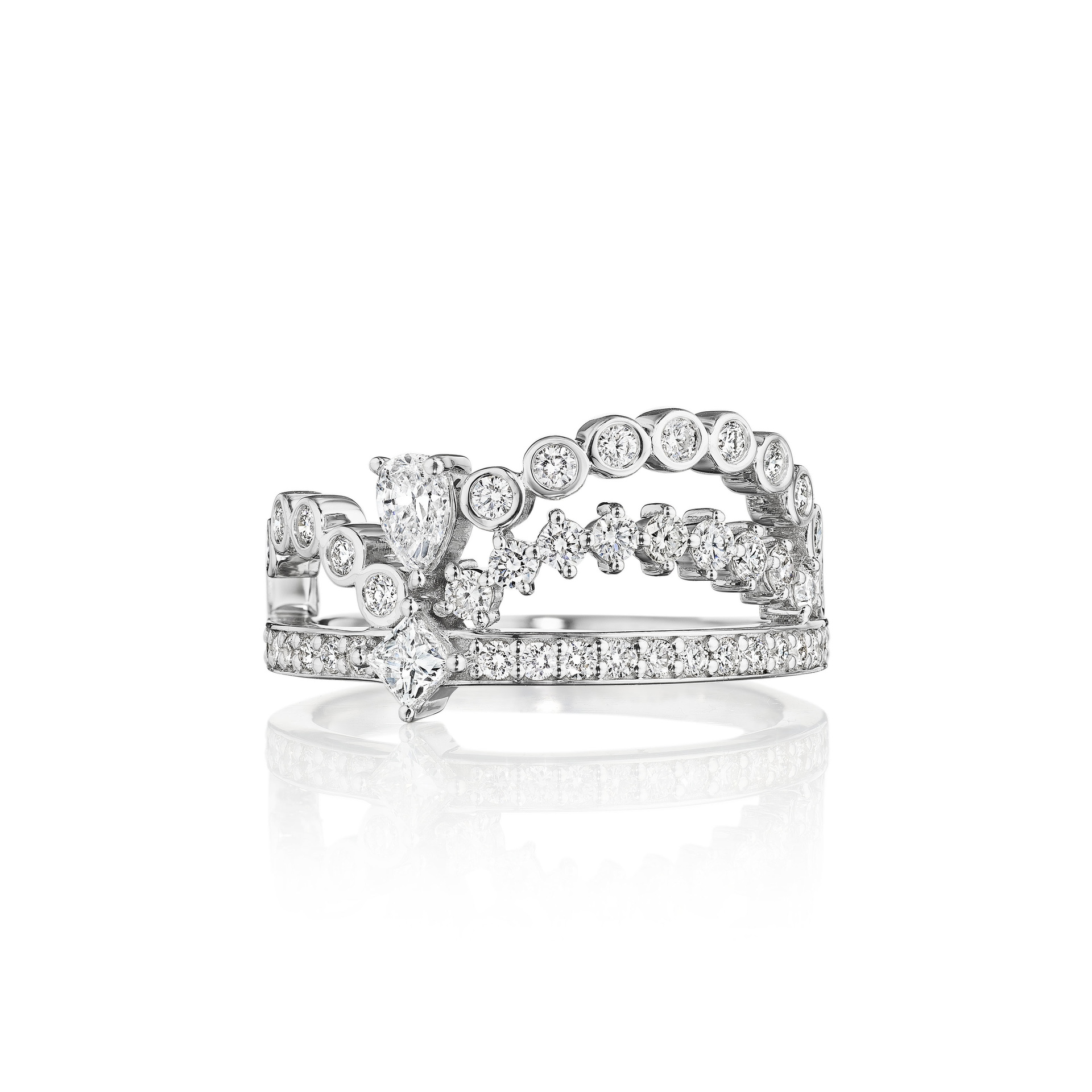 This 18K gold ring radiates power and poise with .88 ctw of diamonds — .16 ct pear shape, .09 ct princess cut, and .63 ct round brilliant stones — meticulously set in an open, asymmetrical design.
