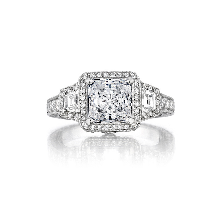 Holds a Radiant Cut Center Stone and Trapezoid Cut Side Stones