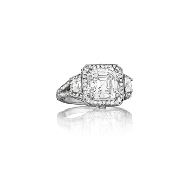 Holds an Asscher or Radiant Cut Center Stone and Trapezoid Side Stones