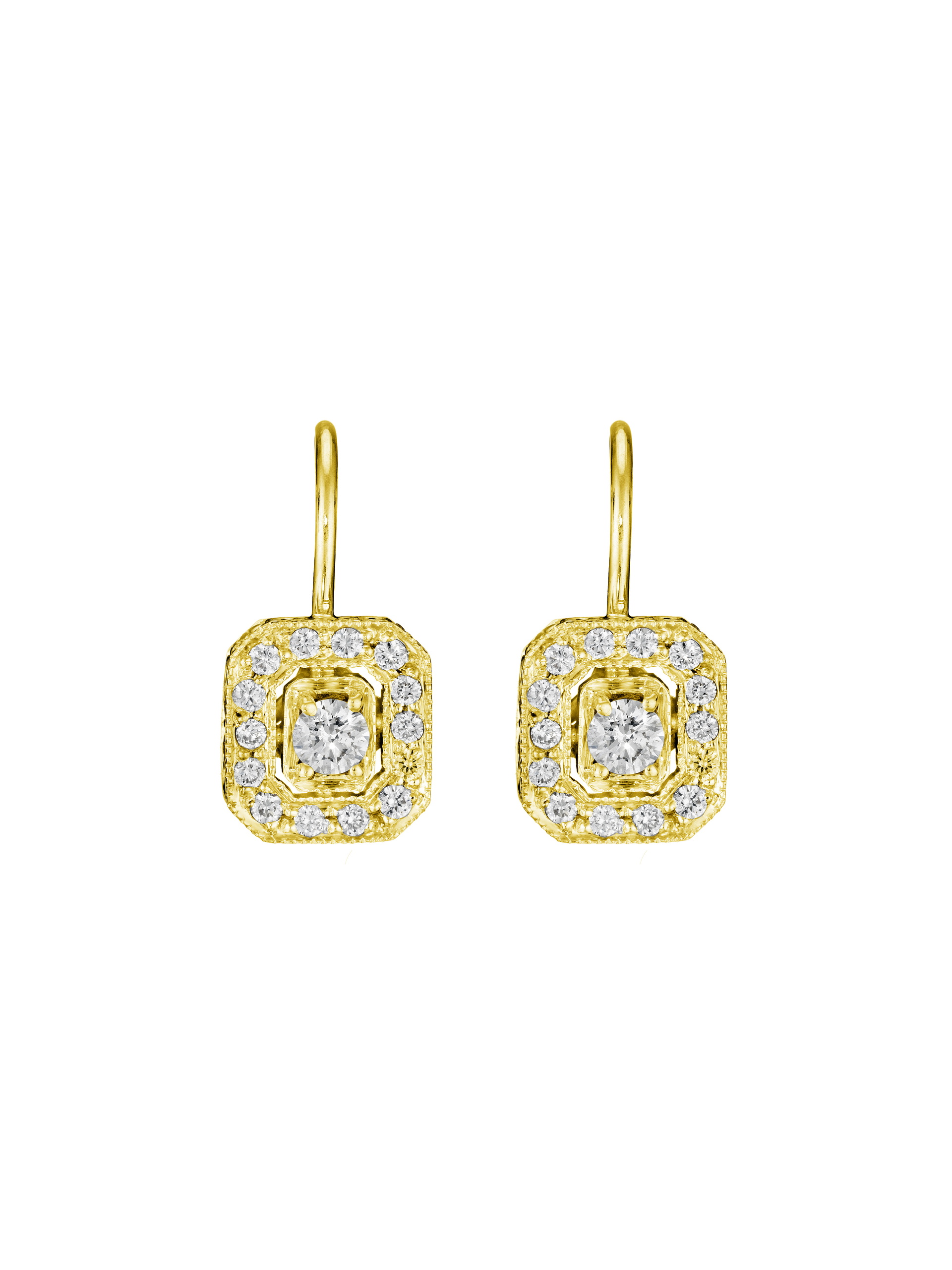 The Classic Emerald Shape Earrings showcase over one half carat of round brilliant diamonds delicately arranged in an emerald shape. Set in 18k gold, these drop earrings bring understated glamour to any look.