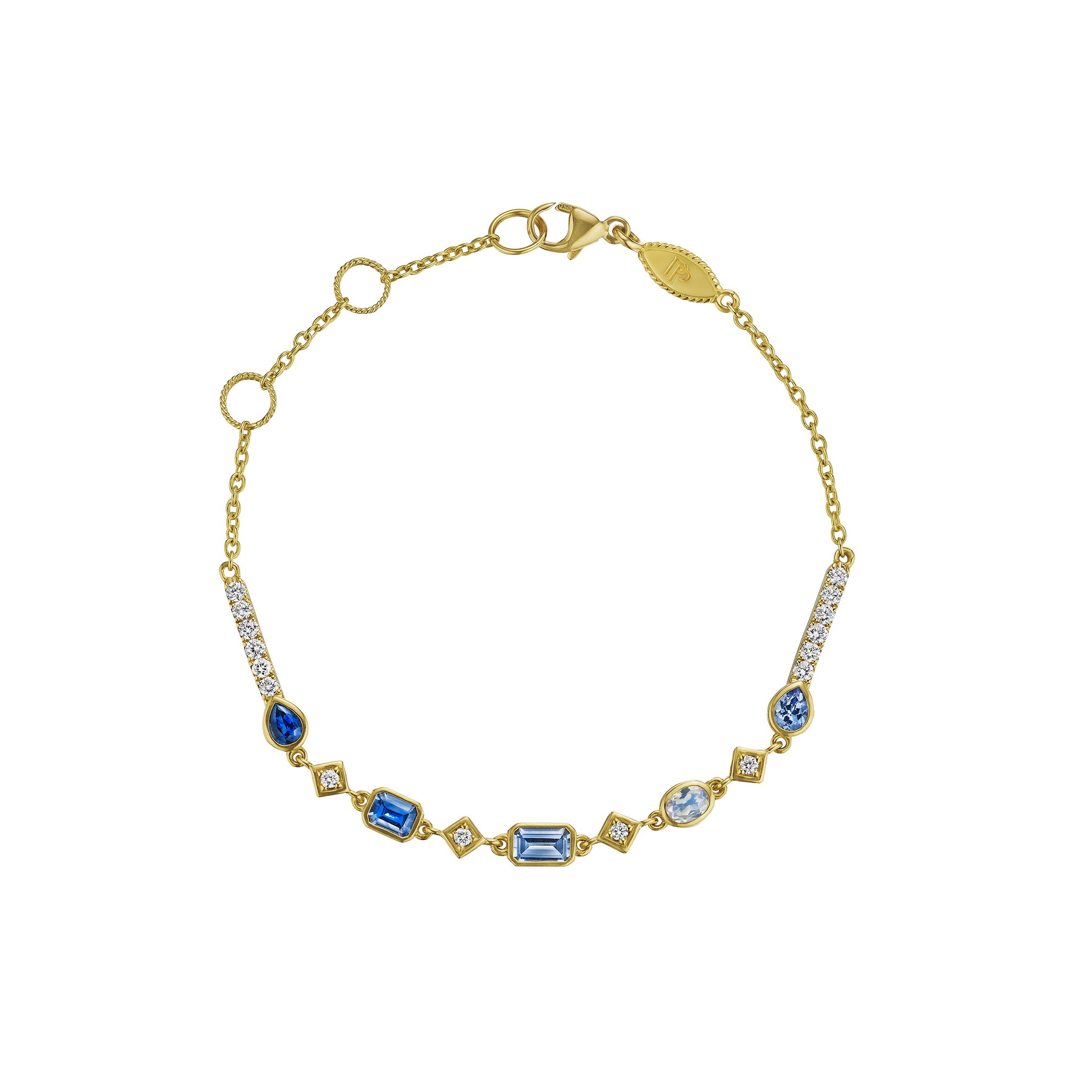 This graceful chain bracelet captures the movement of moonlight with .69 ct of vivid blue sapphires, .19 ct of luminous moonstone, .18 ct of tanzanite, and .33 ct of sparkling diamonds.