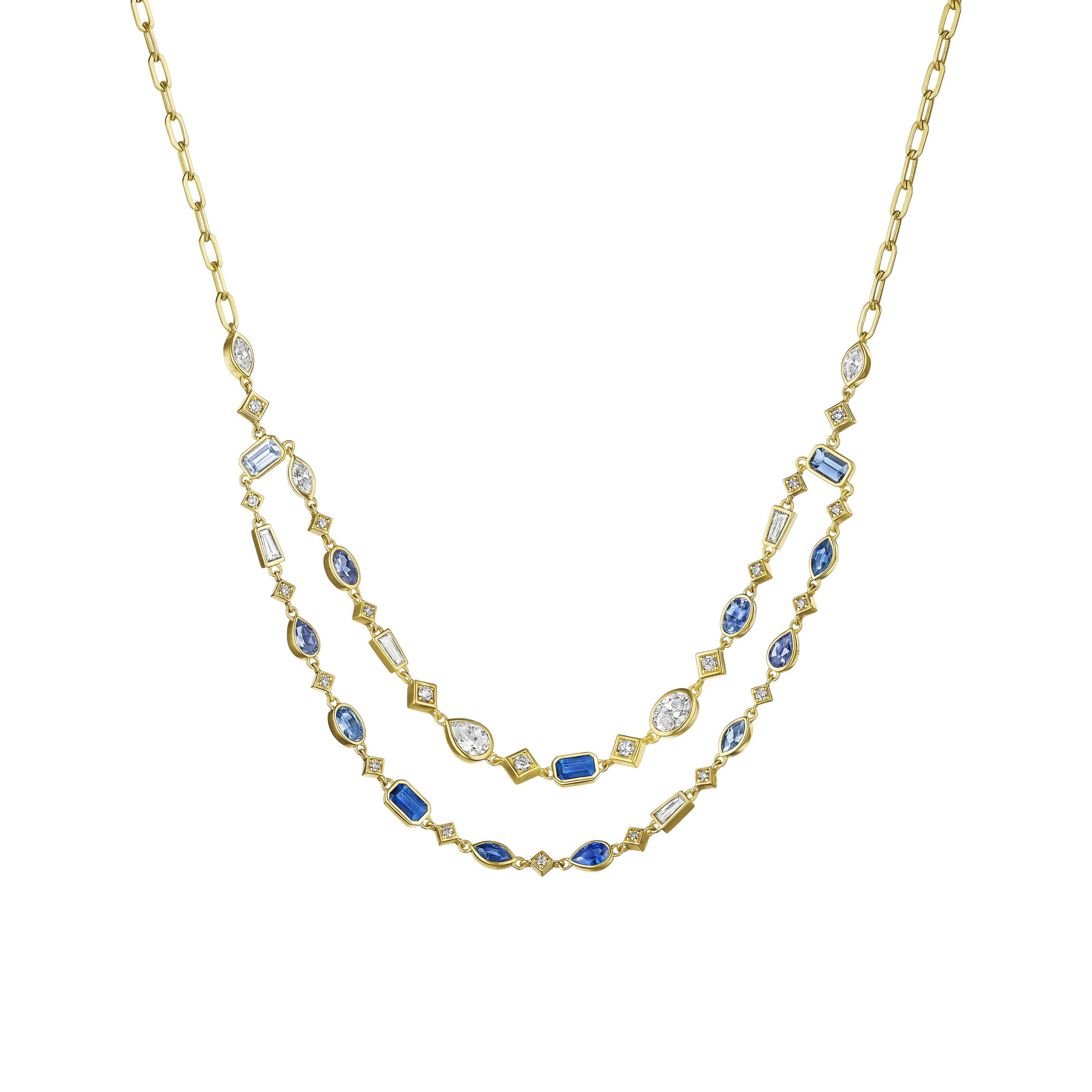 This dramatic necklace evokes the joy of a night under the stars, featuring 2.13 ct of diamonds and 3.24 ct of moonstone, tanzanite, and blue sapphire.