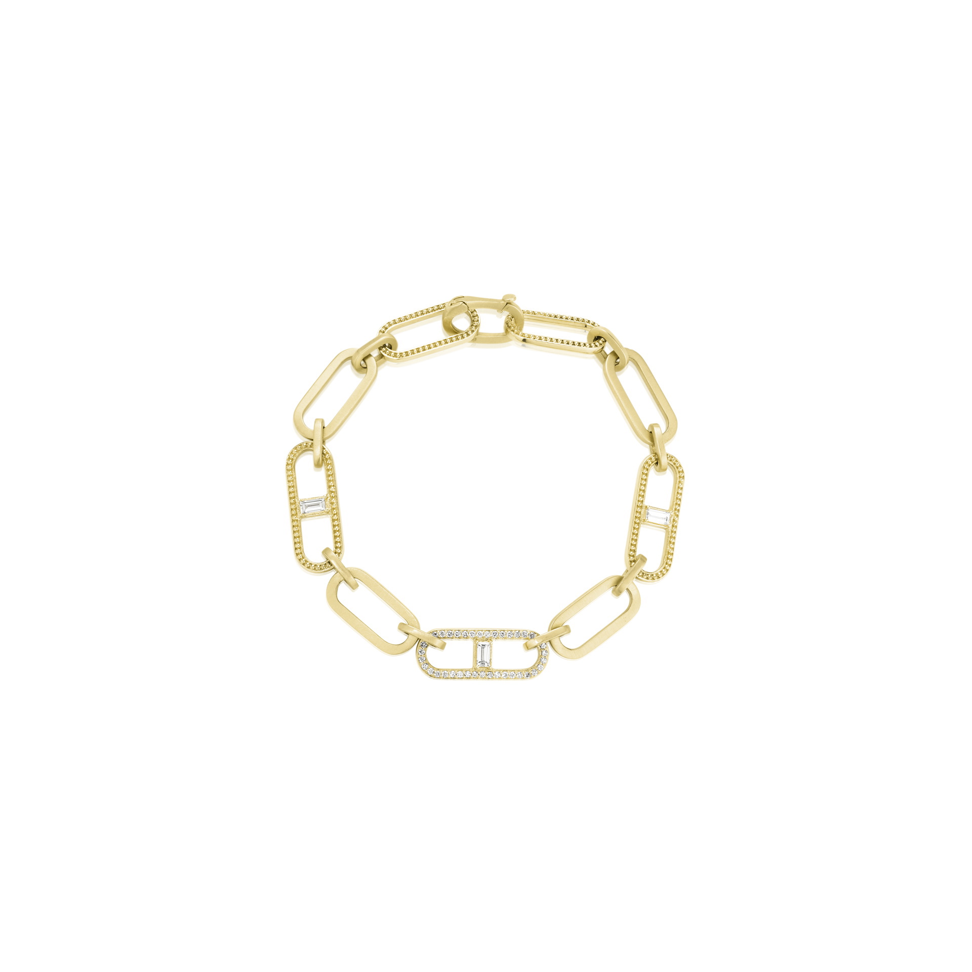 The Diamond Baguette Station Flat Link Bracelet takes your favorite chain bracelet style to the next level. Your wrist will be adorned with 3 step-cut baguette diamonds and pave round brilliant diamonds totaling 0.56 carats, set securely within interchanging solid, diamond, and beaded 18K gold elongated links. This baguette diamond bracelet is as simple as it is luxurious, and will take you from the office to a night out effortlessly.