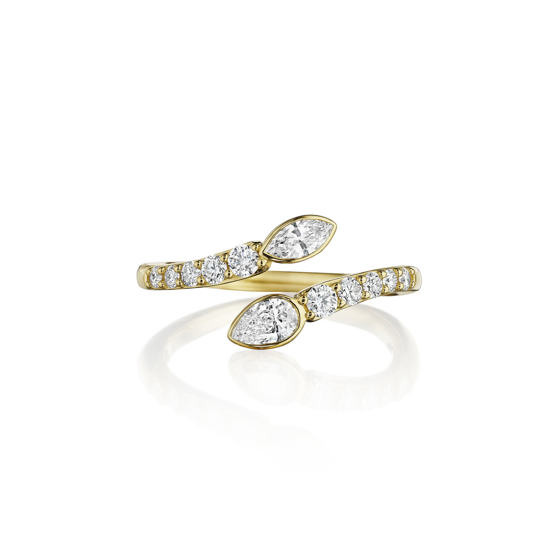 Two graceful arcs of 18K gold meet in this bypass design, sparkling with .65 ct of marquise and round brilliant diamonds.