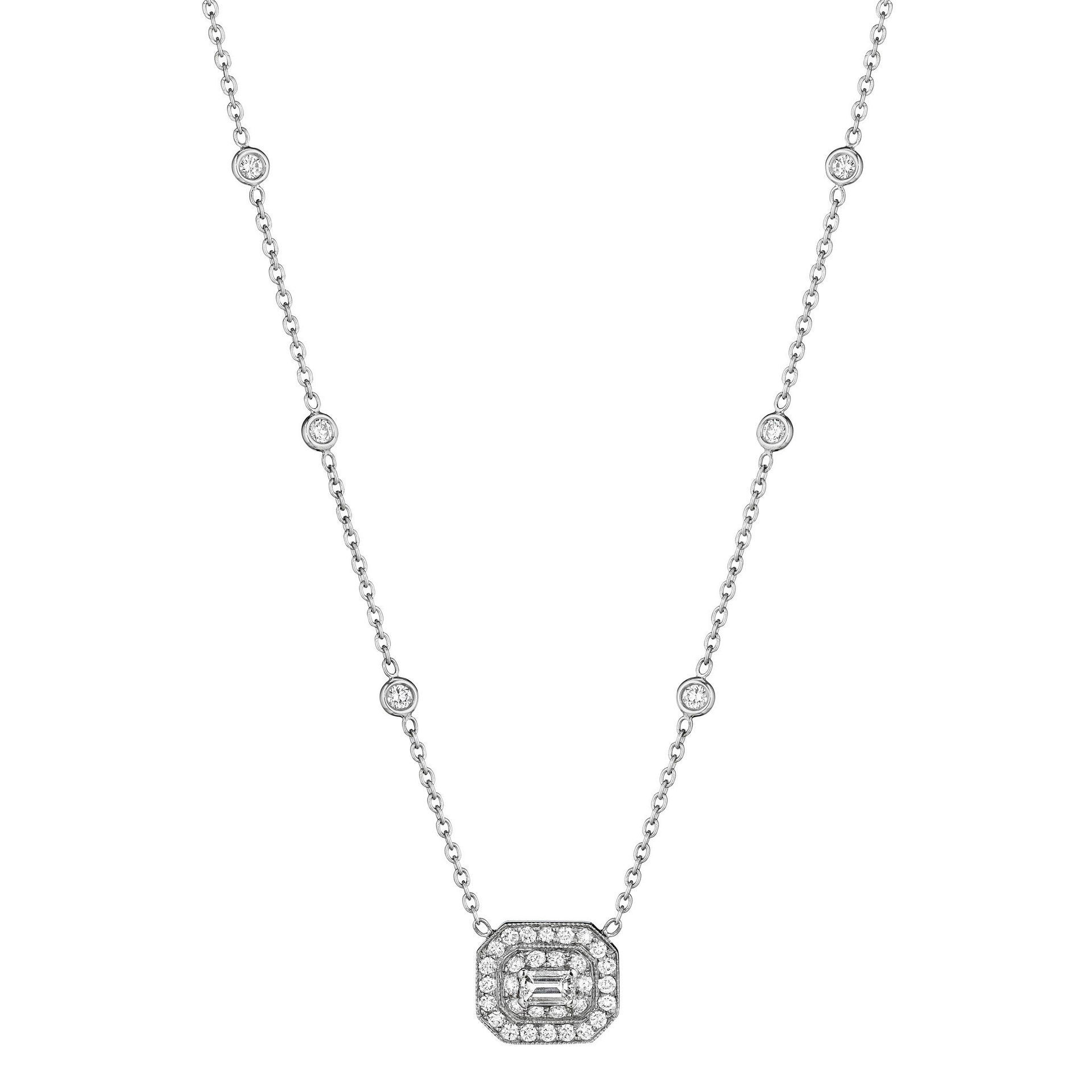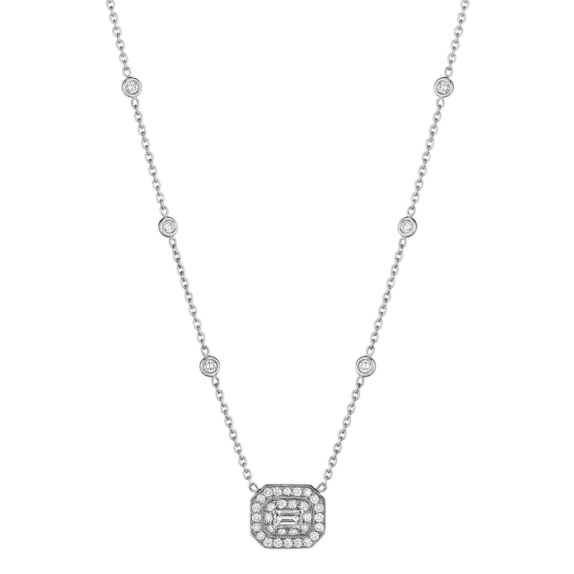 The vintage inspired Emerald-Cut Art Deco Necklace captures the geometric glamour of years past. This timeless diamond pendant necklace features 1.55 carats of round brilliant and emerald shape diamonds and an 18k solid gold chain. Wear alone or layered with others for a unique look.