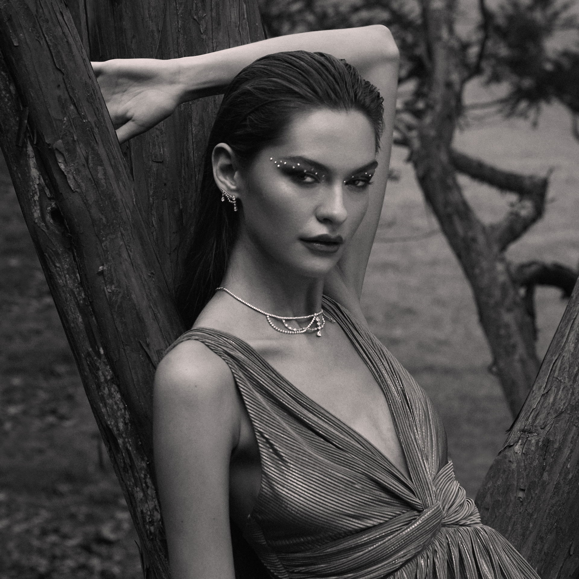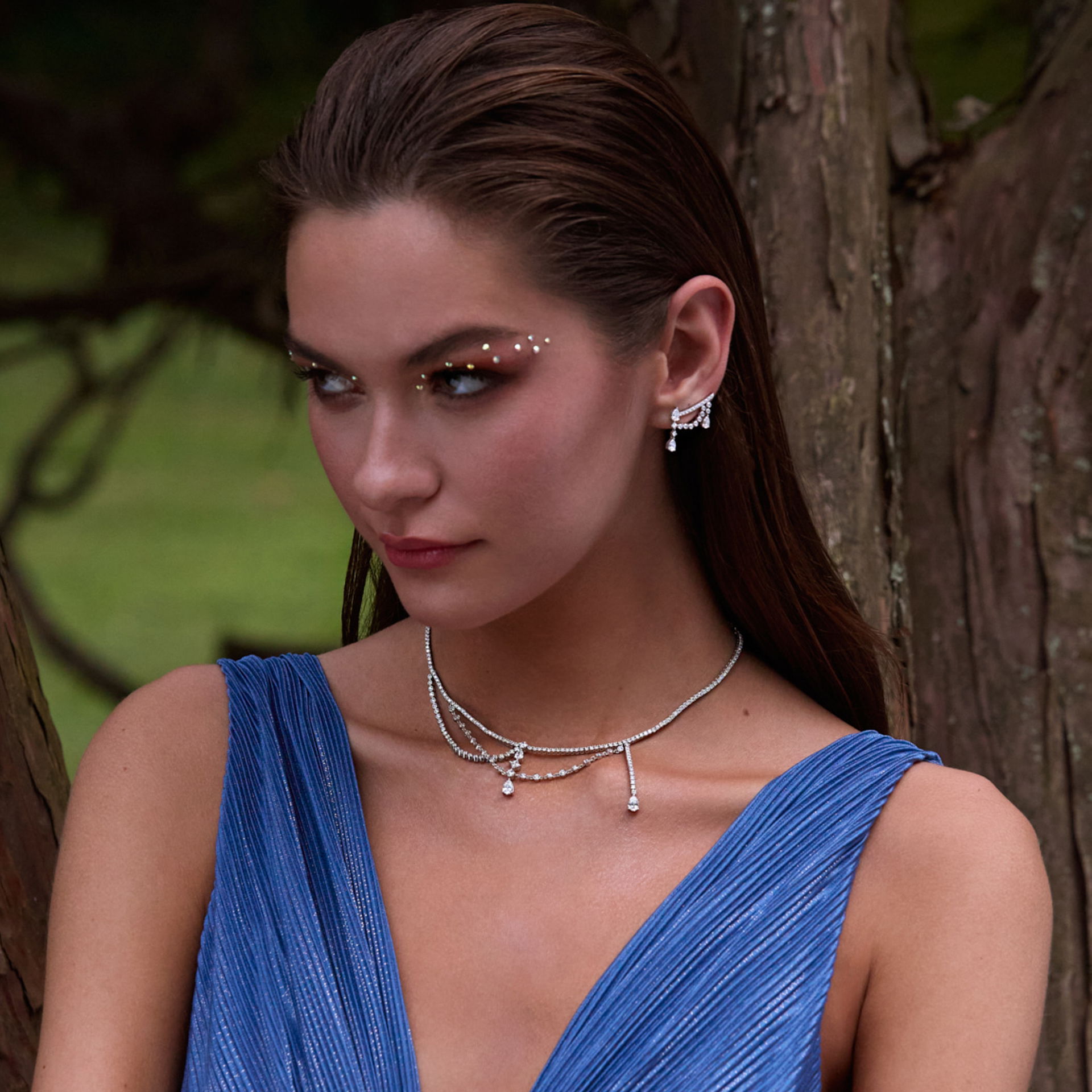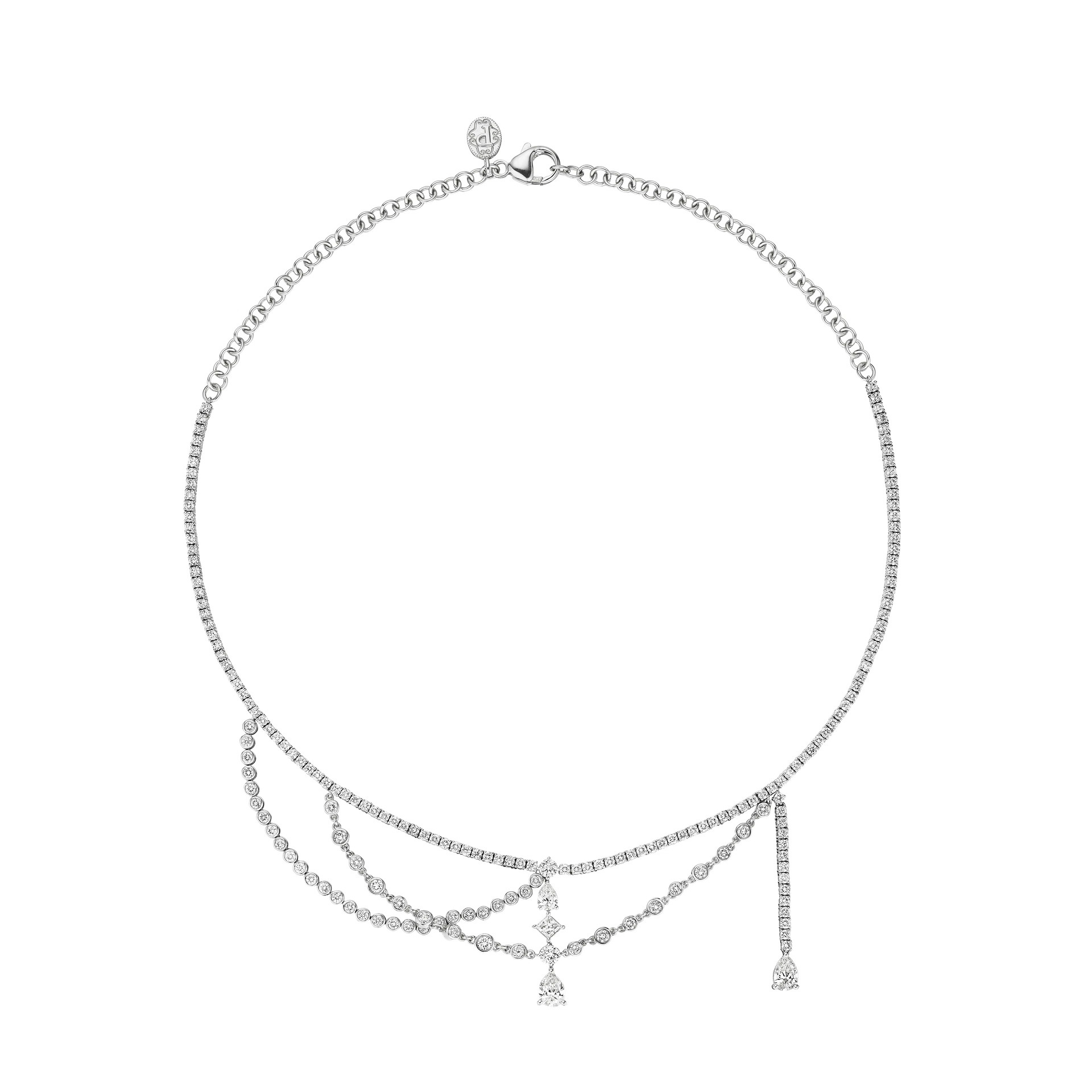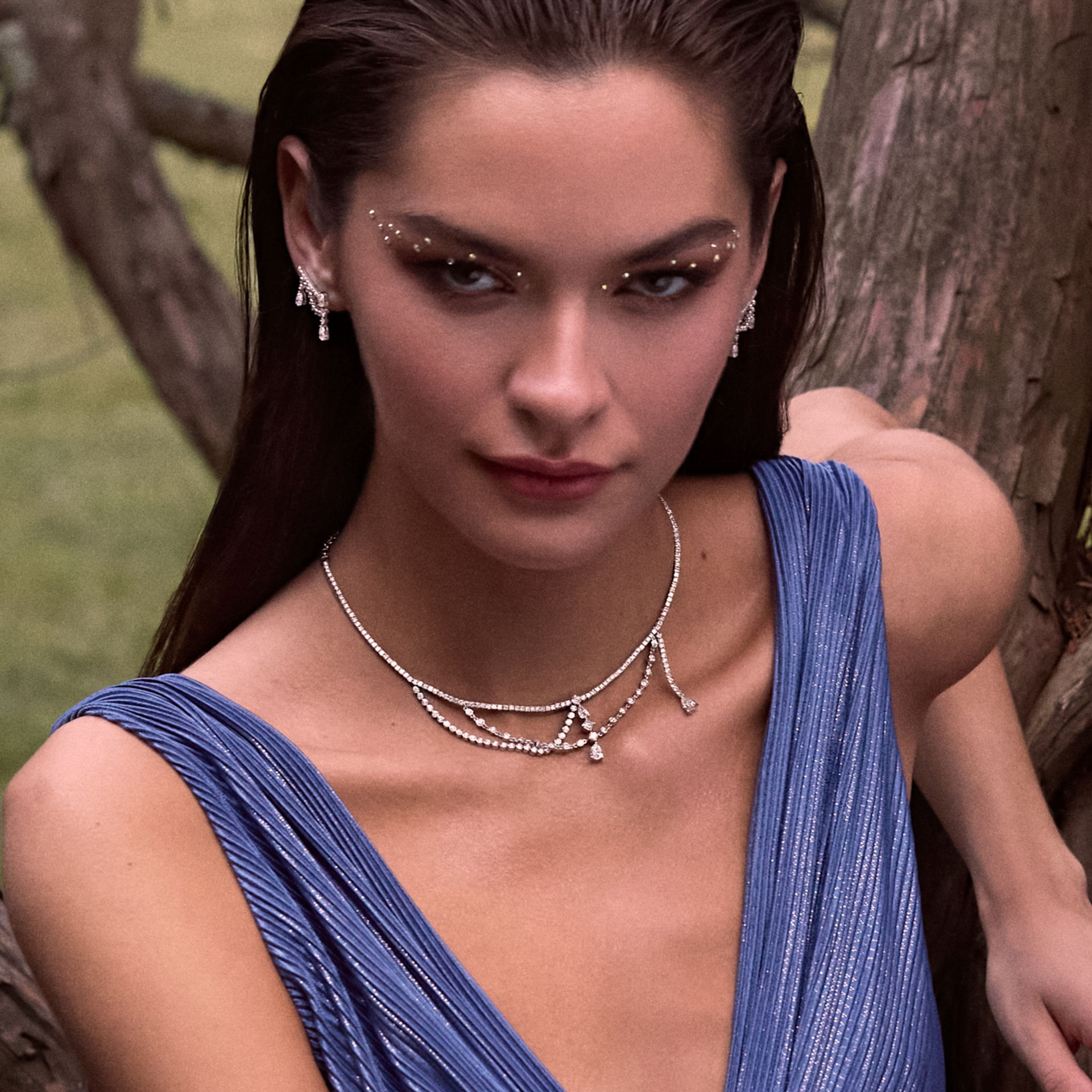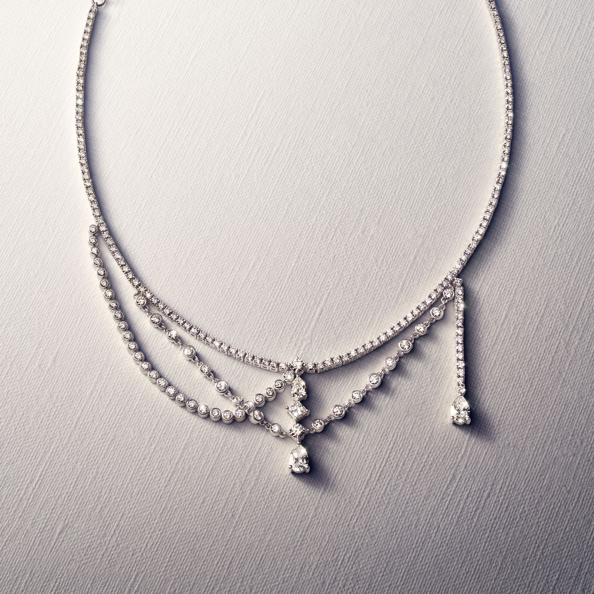 The Goddess Asymmetrical Necklace celebrates divine balance through contrast and motion. Set in 18K gold, it features 6.57 ctw of diamonds—including 5.12 ct round brilliant, 1.20 ct pear shape, and .25 ct princess-cut stones —that cascade with graceful asymmetry.