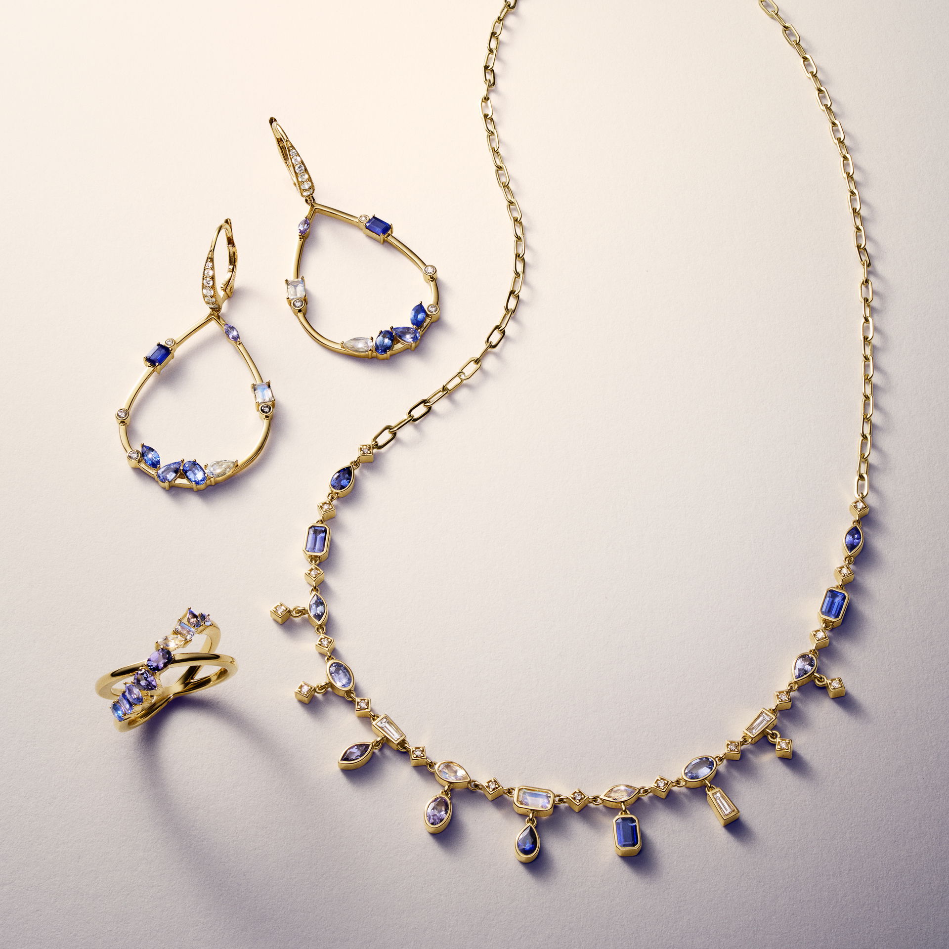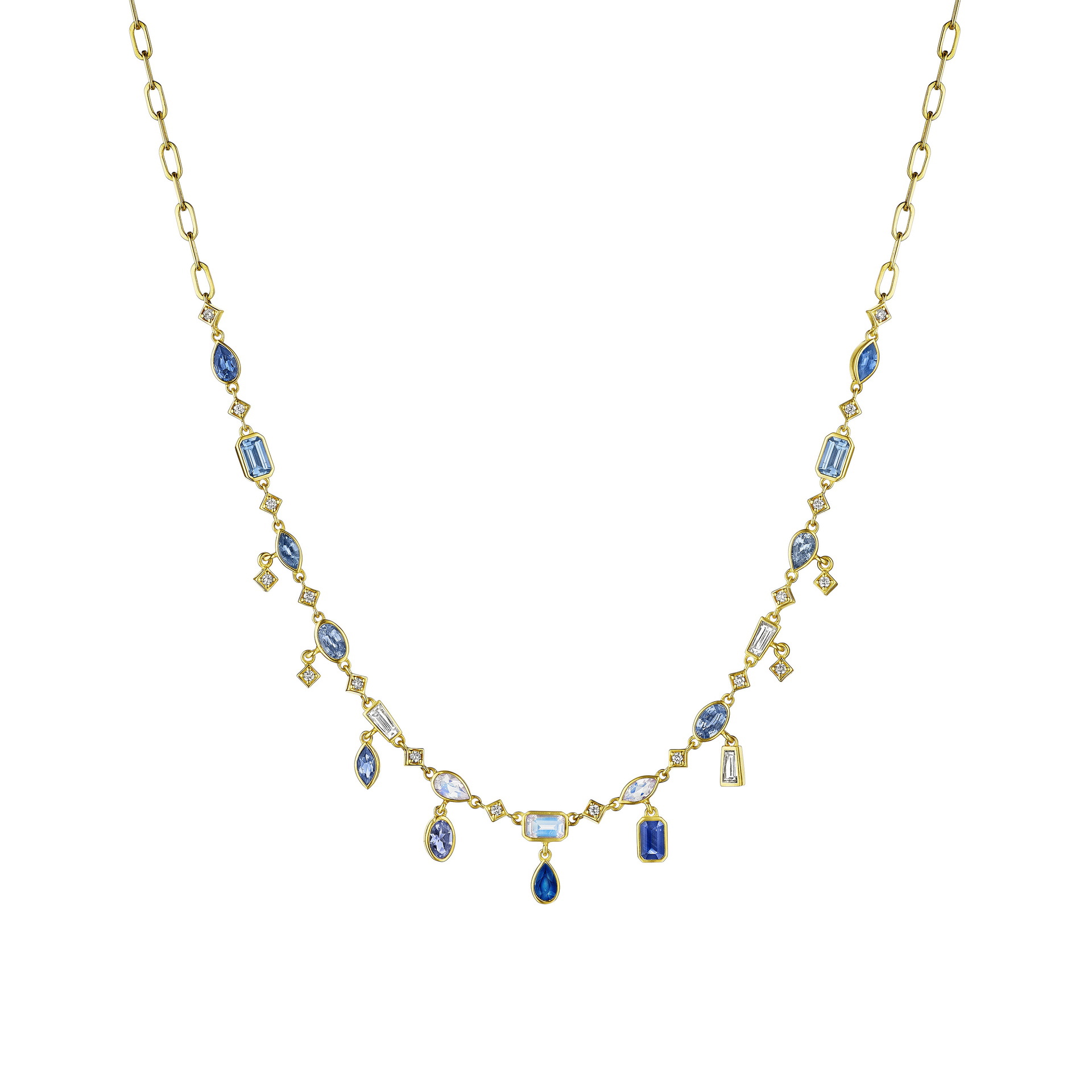 This dramatic necklace evokes the joy of a night under the stars, featuring .59 ct of diamonds and 4.02 ct of moonstone, tanzanite, and blue sapphire.