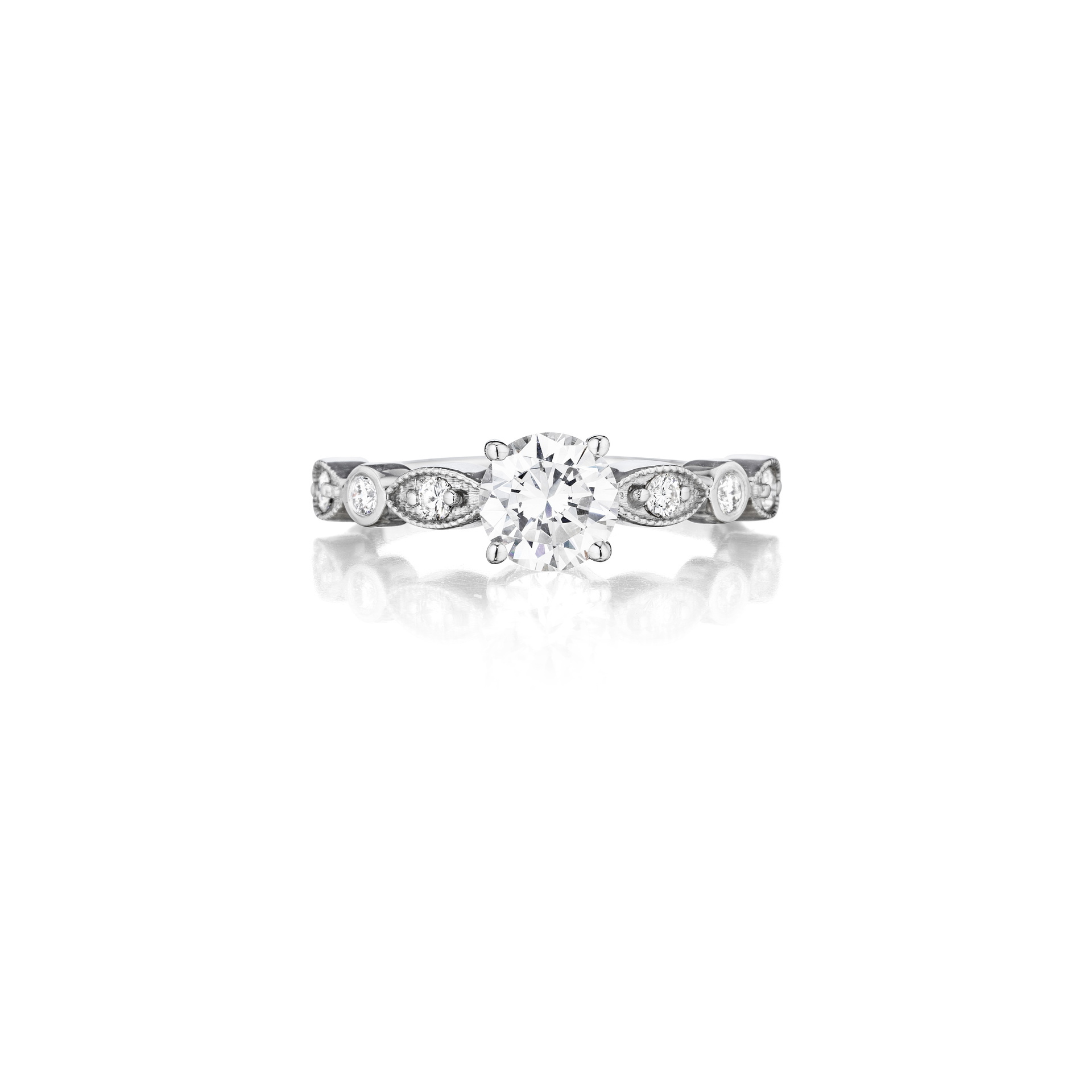 Holds a Round Brilliant Cut or Cushion-Cut Diamond Center Stone