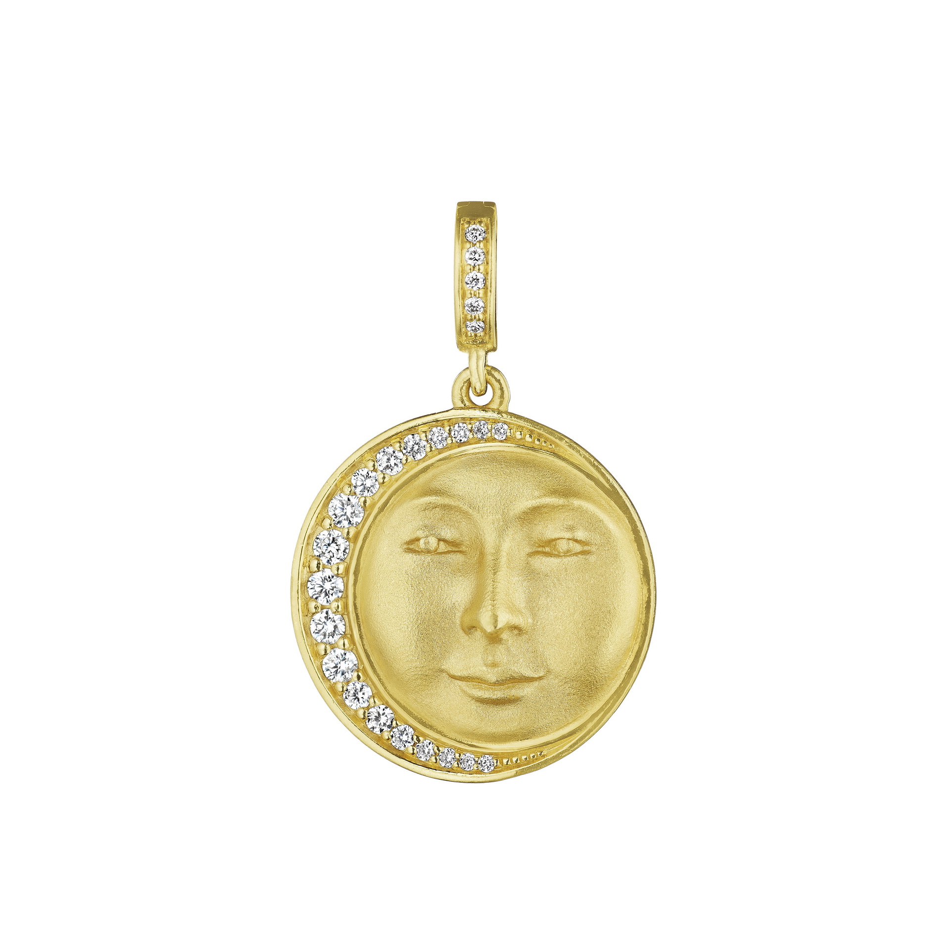 This poetic 18K gold medallion features a serene sculptural moon face illuminated by .30 ct of hand-set diamonds across its 19 mm form. The “Man on the Moon” design celebrates the magic of imagination and the eternal connection between the cosmos and the human spirit.