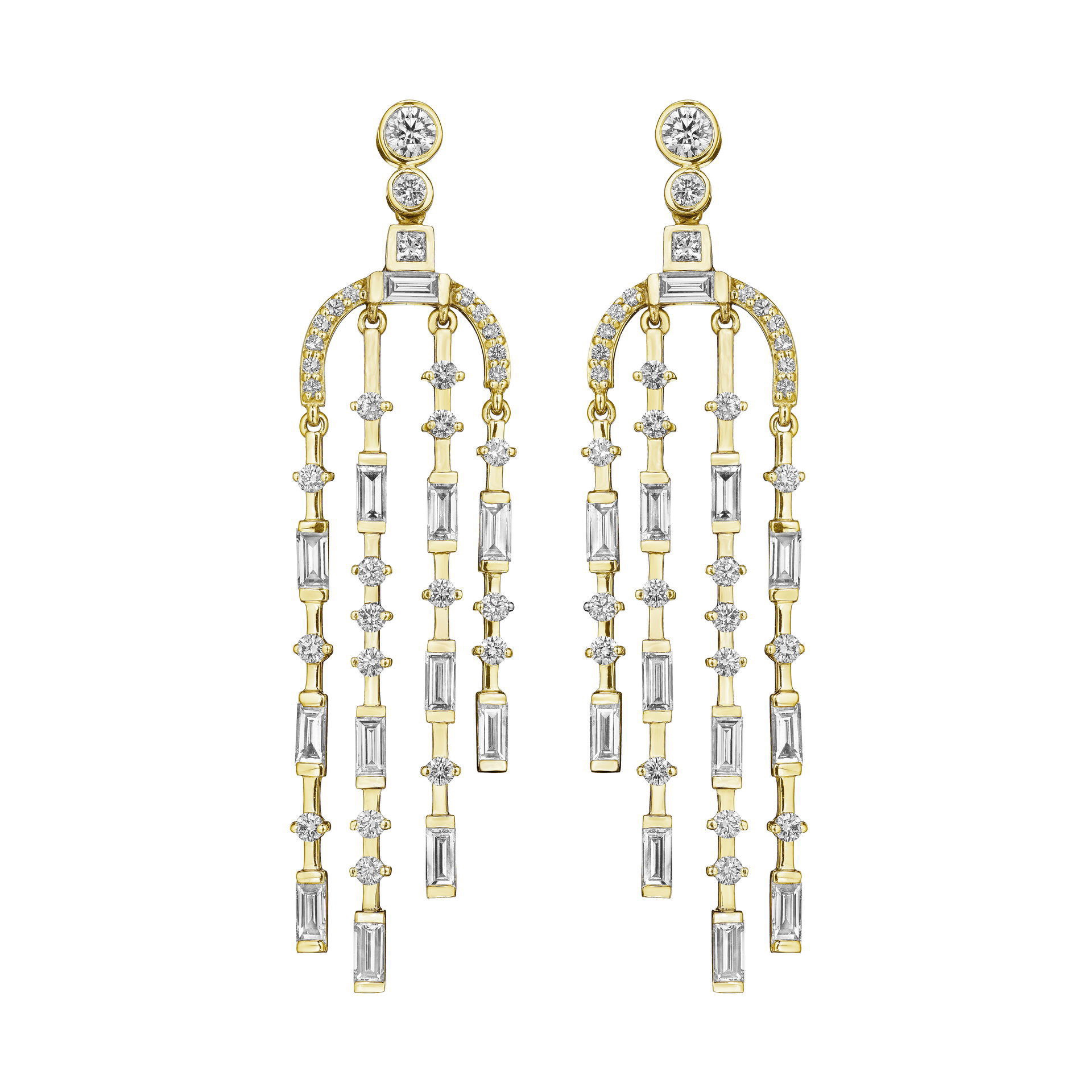 Let confidence wash over you with these sparkling Mixed Shape Waterfall Earrings. Crafted with 18K gold, 5 strands of cascading fancy cut round, baguette, and princess cut diamonds add elegant flair and subtle movement to your ear.