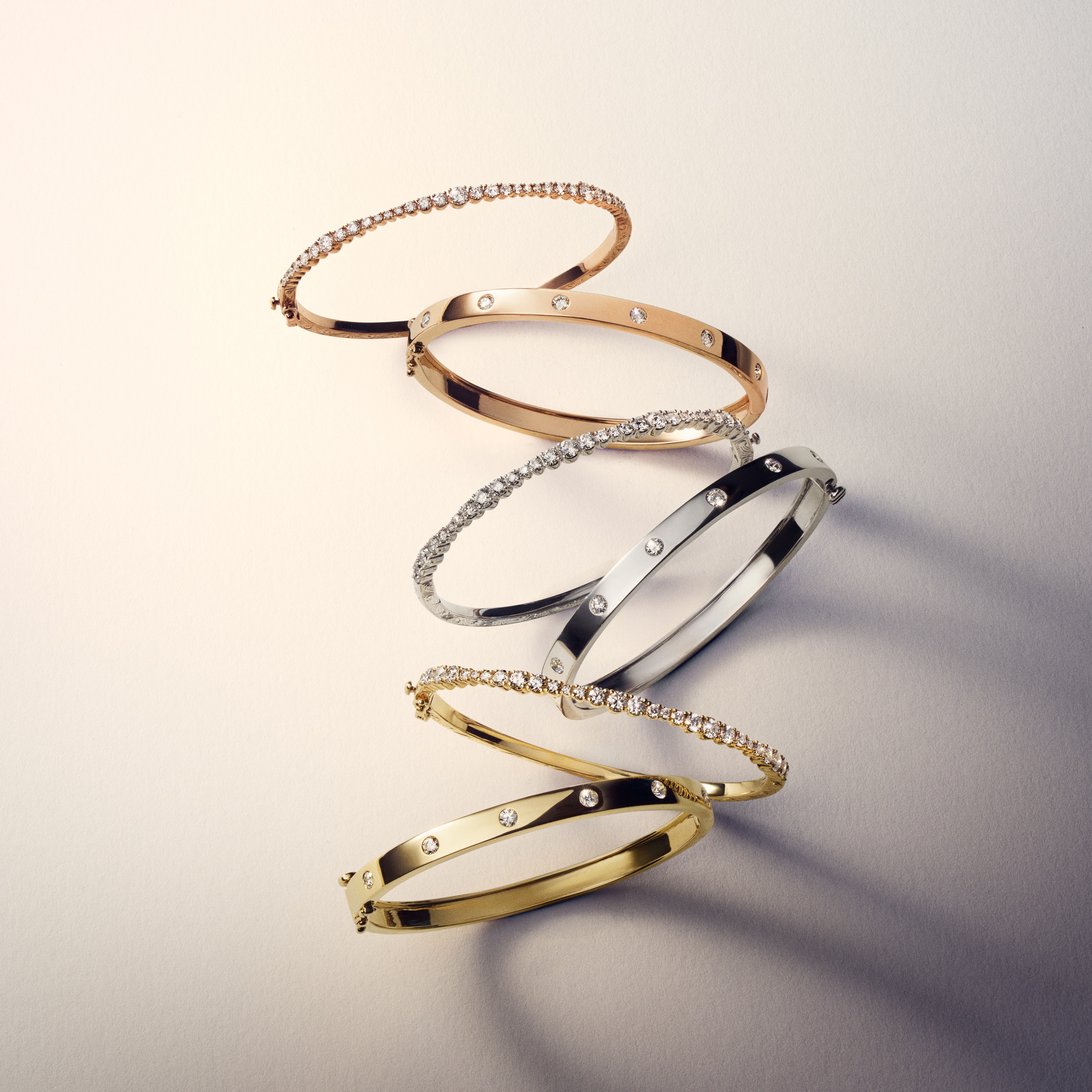 The Moderne Deco Burnished Bangle beautifully captures the geometric glamour of years past in a stunning 18K gold, Art Deco inspired bracelet. Showcasing 0.60 carats of round brilliant diamonds, this diamond bangle will become a timeless staple in your collection.