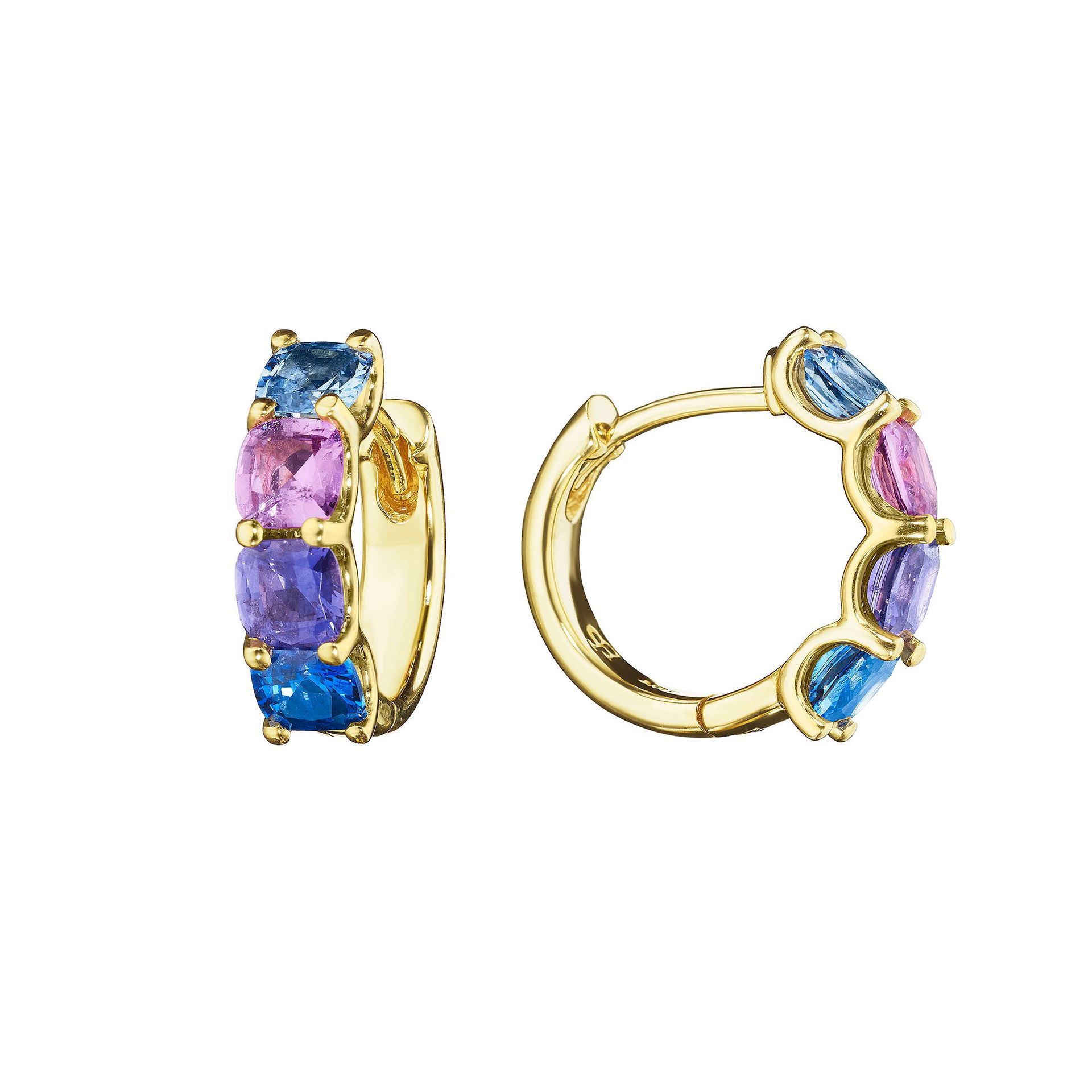 The Ombre Blue Sapphire Hoop Earrings brings the vivid colors of the ocean to life. These fun earrings feature a total of 3.44 carats cushion cut ombre blue sapphires on an 18K gold post with a hinge closure. Wear these gold hoop earrings when you want to add a pop of elevated color to your wardrobe, day or night.