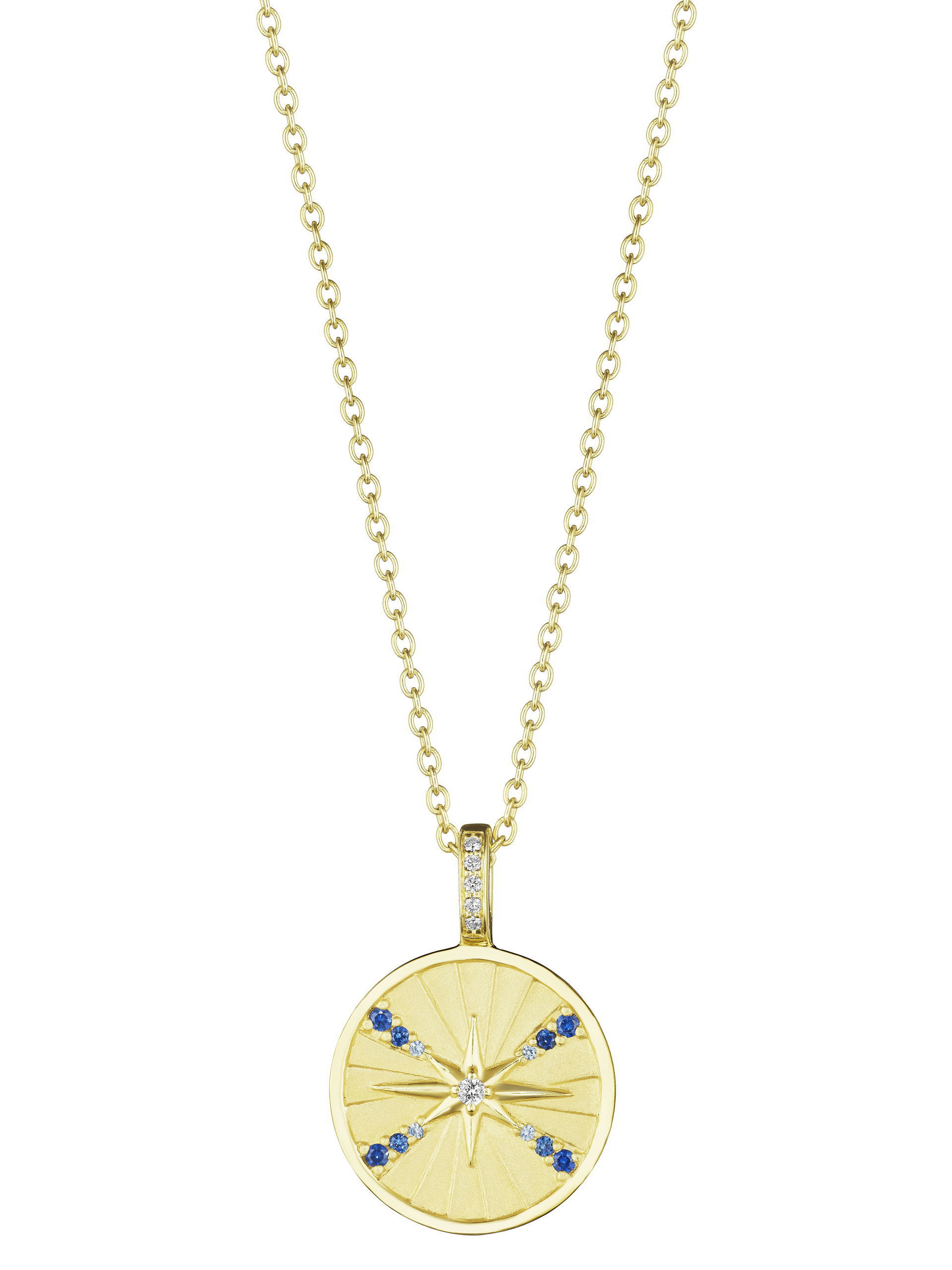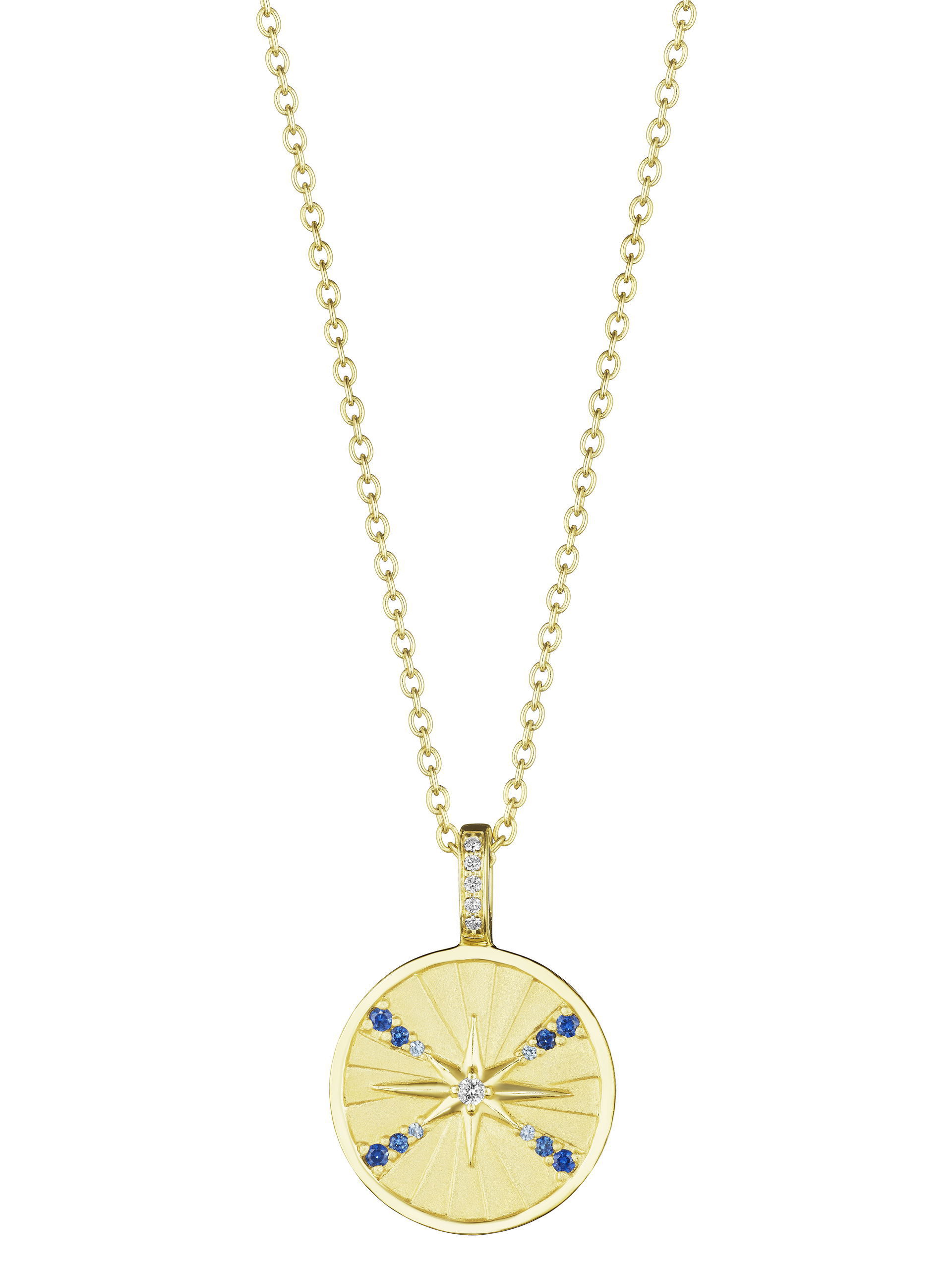 The Ombré Blue Sapphire Starburst Medallion Necklace brings the beauty of the night sky alive. This 18K gold starburst medallion shines with a total 0.05 carats of round brilliant diamonds and 0.14 carats of ombré blue sapphires.