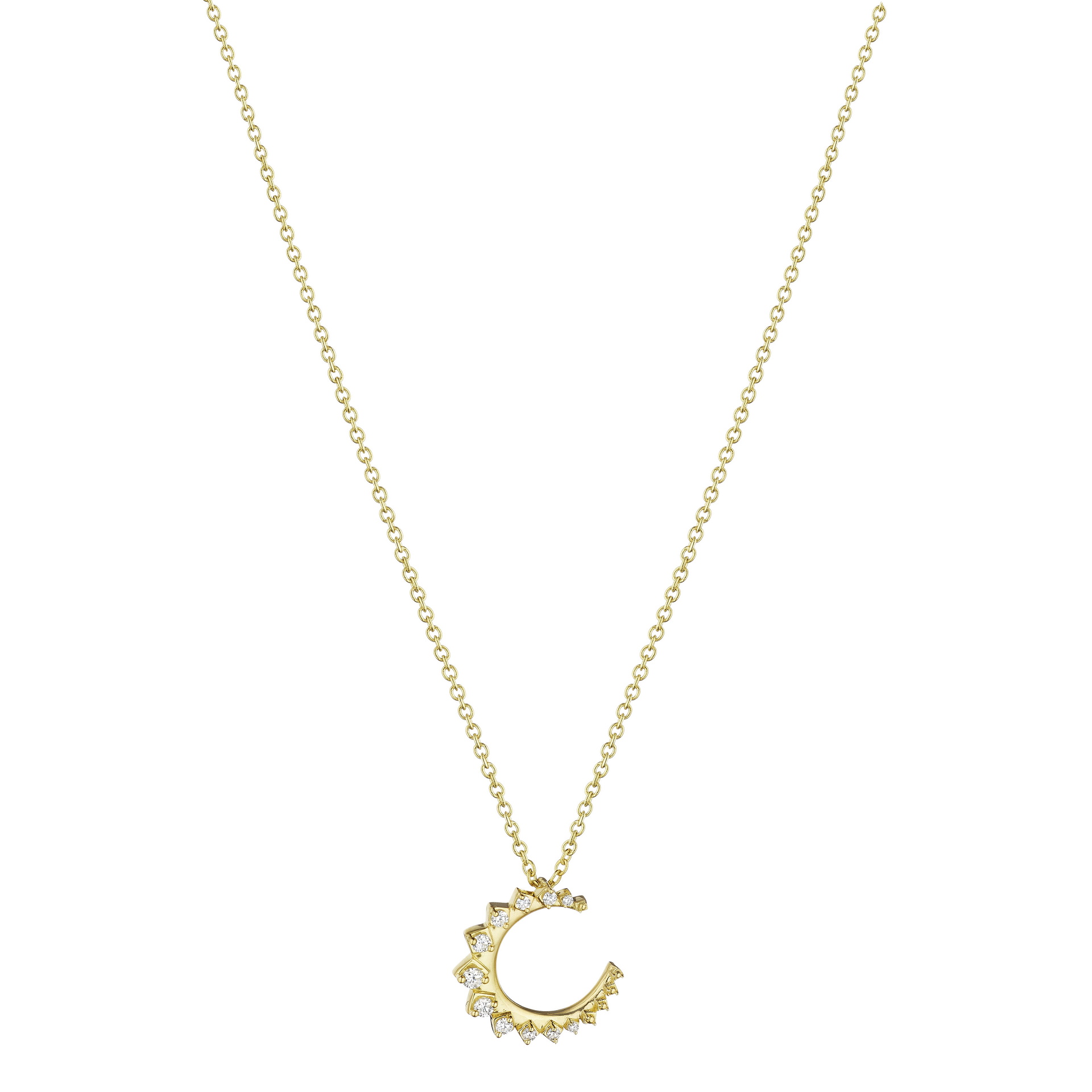 Graceful and romantic, the Petite Diamond Studded Moon Necklace captures the mystery of the night sky. Set in glowing 18K gold, it features .22 ct of pavé diamonds outlining a luminous crescent moon—symbolizing intuition, change, and divine feminine energy.