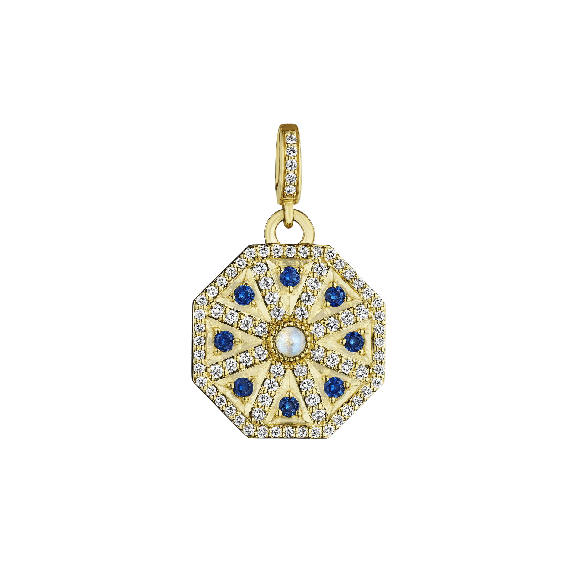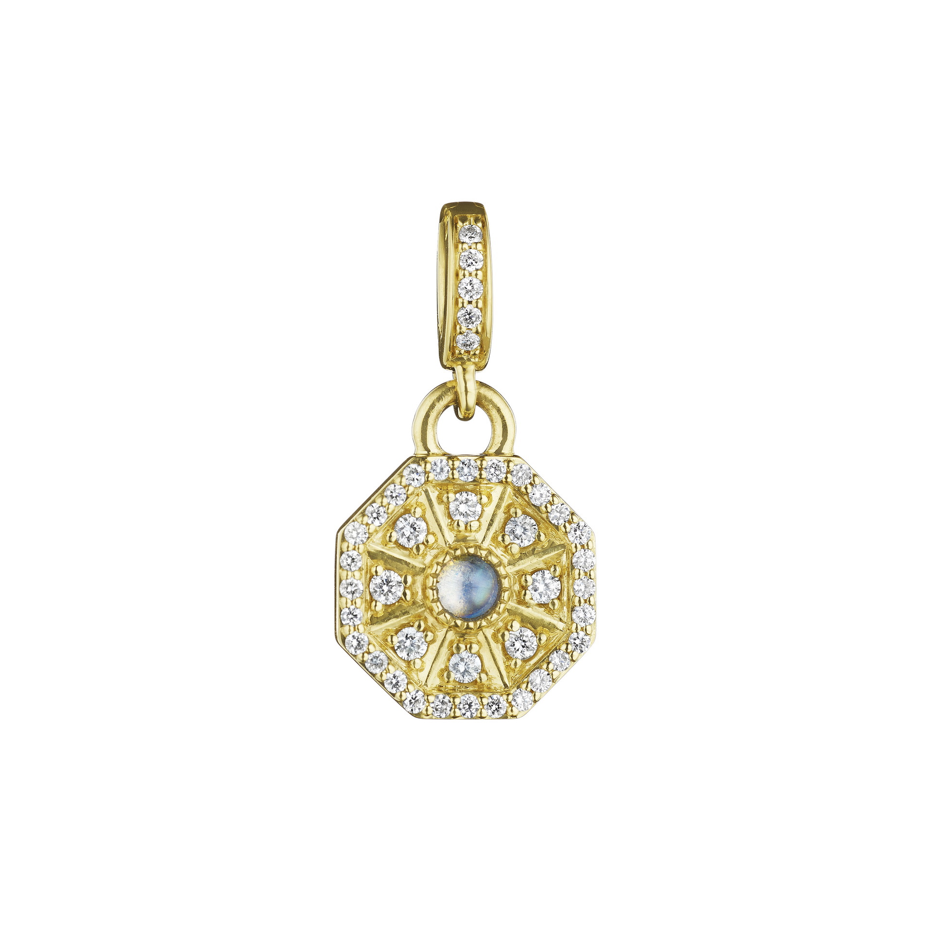 This 12 mm 18K gold medallion offers a dainty interpretation of balance, set with .28 ct of diamond and moonstone accents.