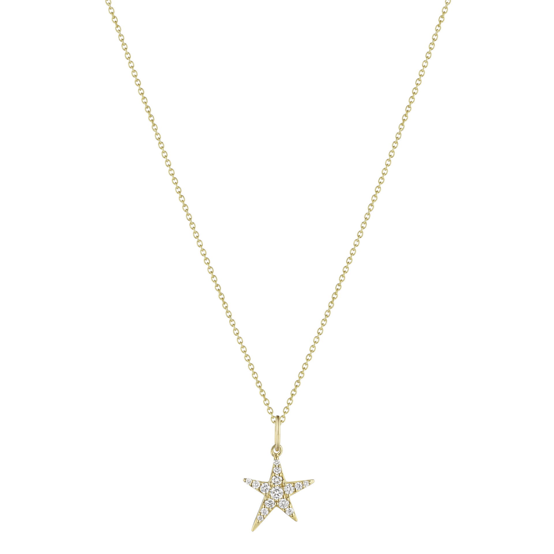 Shine bright in the Petite Penny Five-Point Star Necklace. Crafted in 18K gold and accented with .34 ct of sparkling diamonds across a sculpted 14 mm star pendant. The delicate chain adds a graceful finish, resting lightly along the collarbone.