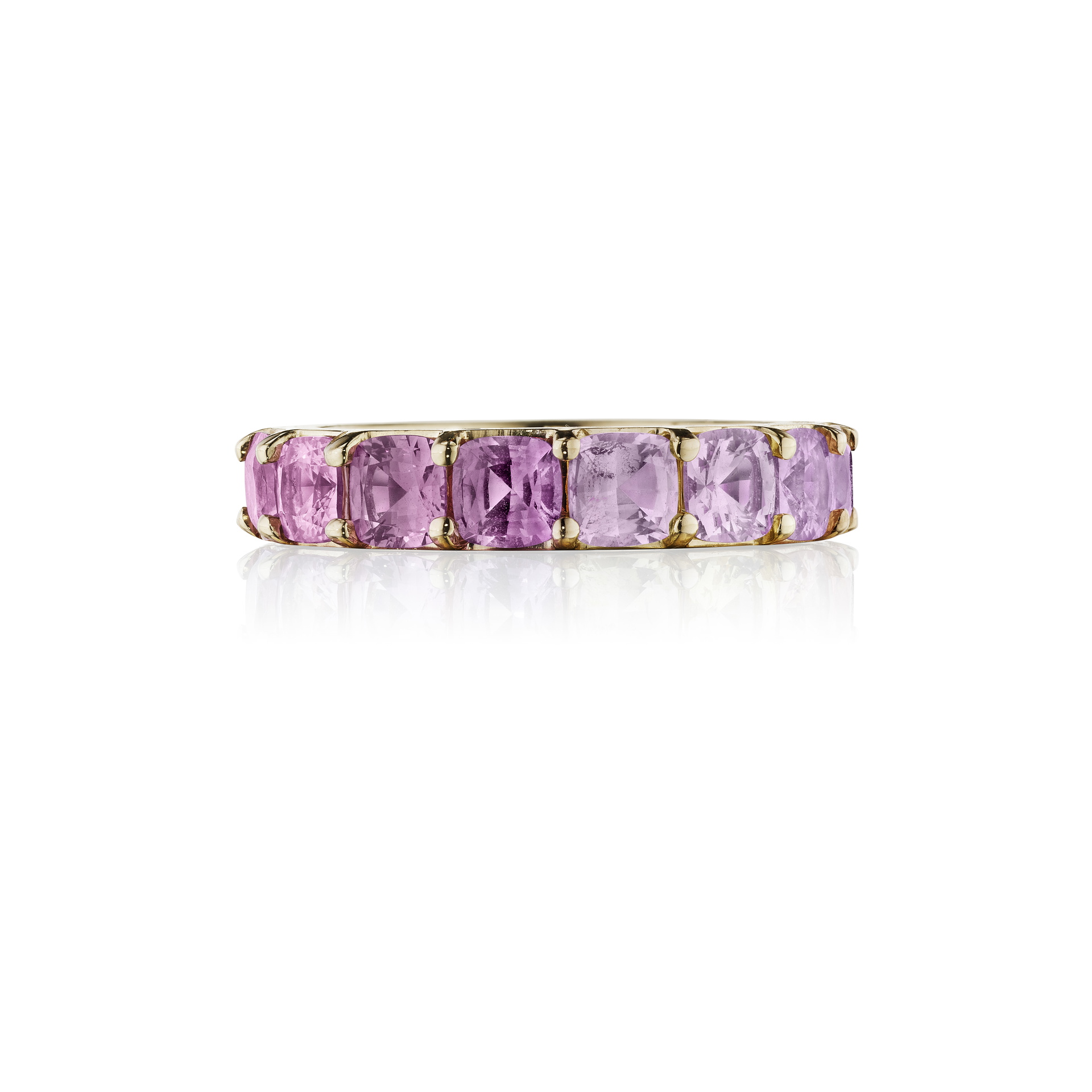 The Ombré Pink Sapphire Band brings to life the vivid colors of a sunrise to life. This eye catching 18K gold ring features a total of 6.40 carats of cushion cut pink sapphires in various hues. Wear this pink sapphire band alone or with other gold rings for a pop of color to your wardrobe, day or night.