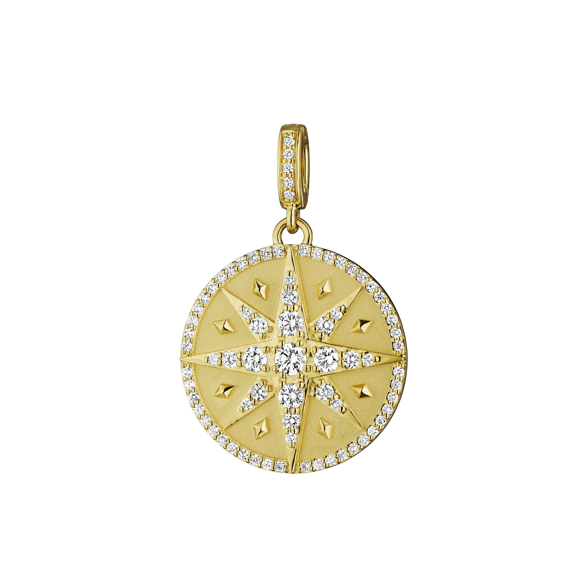 This 21 mm medallion glows with .80 ct of brilliant diamonds meticulously set in a radiant star motif. Crafted in lustrous 18K gold, it captures the dazzling beauty of starlight and the enduring symbolism of guidance and strength.