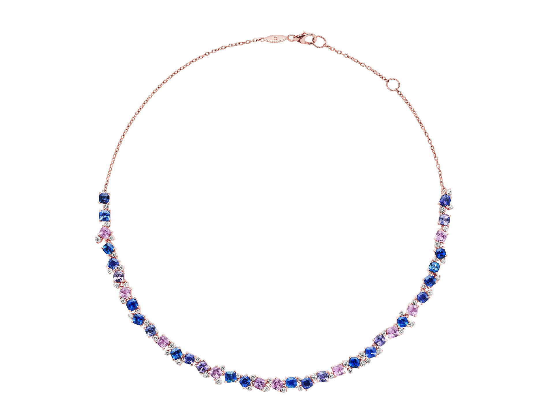 The Rainbow Sapphire Confetti Necklace evokes the beauty of falling confetti in a stunning rainbow sapphire necklace. A total 1.41 carats of round brilliant diamonds are staggered among 15.48 carats of cushion-cut rainbow sapphires along an 18K gold chain. This diamond necklace is sure to highlight your collarbone beautifully.