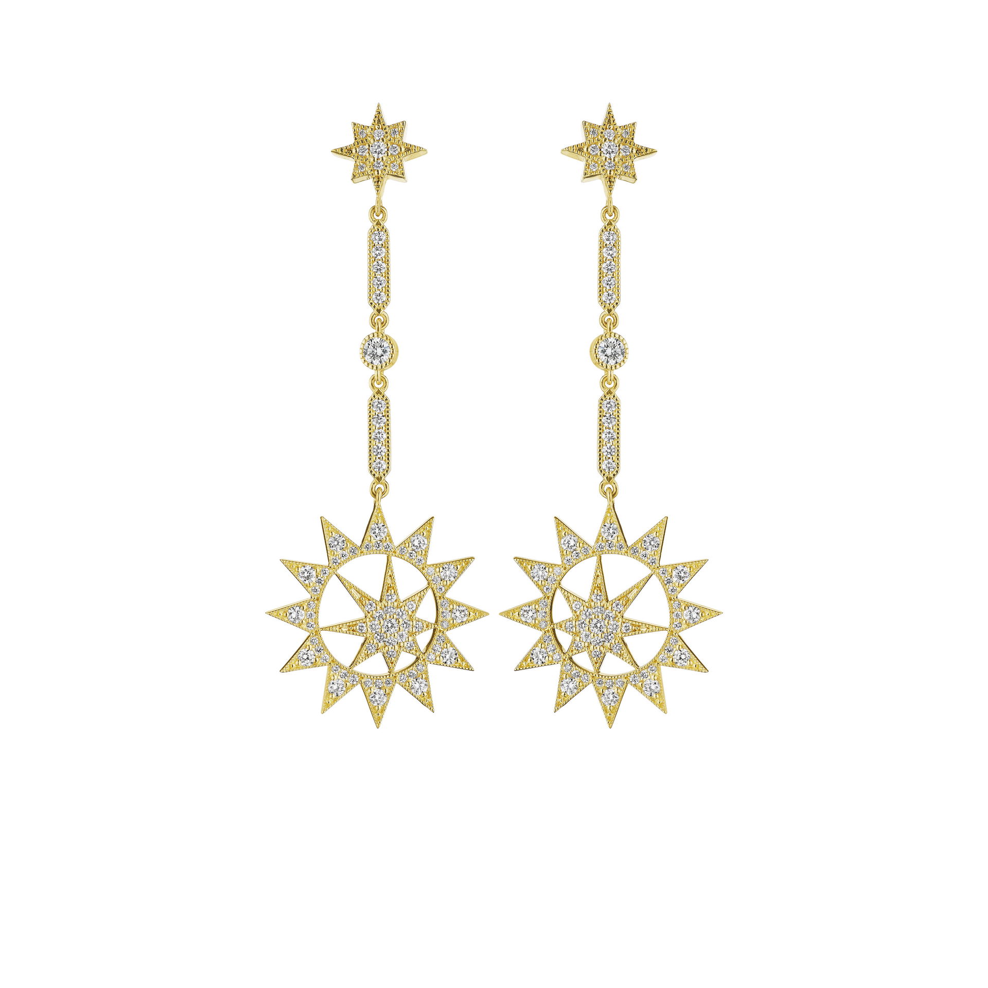 Reach for the stars with these long star earrings, handcrafted in 18K gold and illuminated with 1.11 ct of brilliant diamonds. Measuring 20 mm, each star sparkles like a celestial burst frozen in motion.