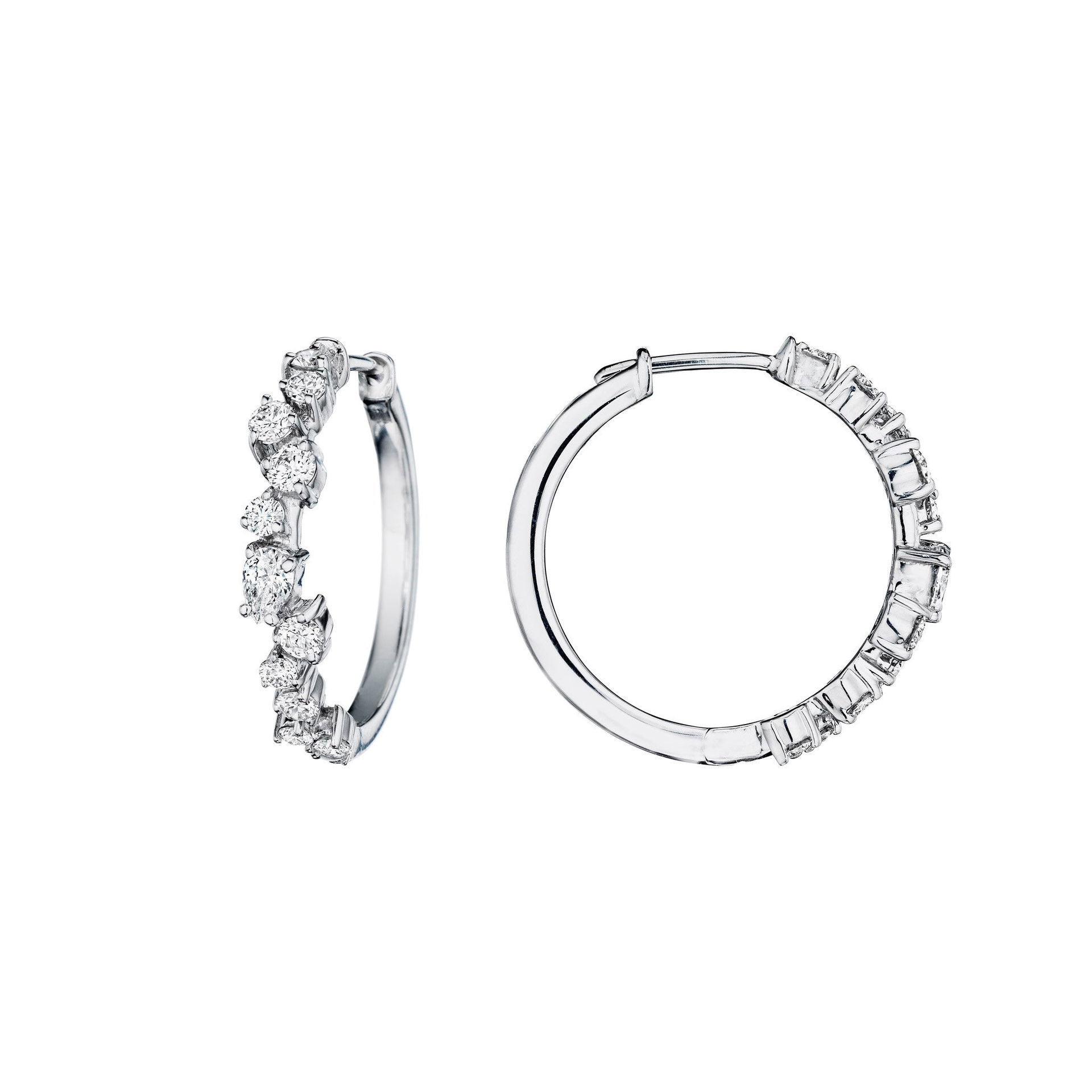 The Baby Stardust Hoop Earring is a brilliant cluster diamond huggie hoop earring that evokes the beauty of falling stars, and can be worn casually for all occasions. A total of 0.59 carats of pear and round and brilliant diamonds are staggered on an 18K gold post.