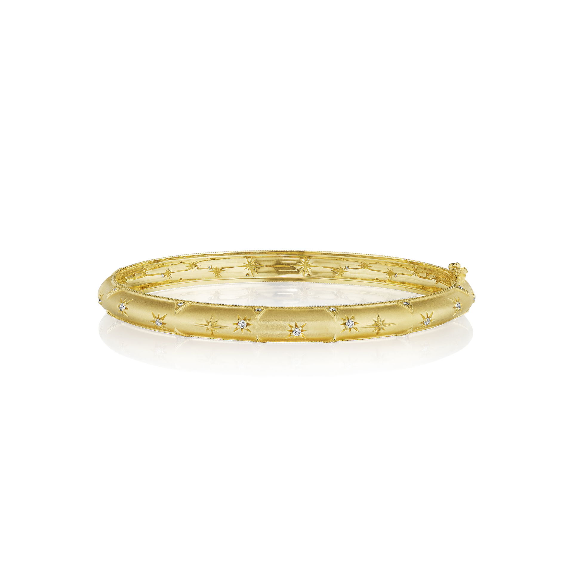Inspired by constellations that guide and illuminate, this 18K gold bracelet features .28 ct of pavé diamonds delicately set across a refined 5.6 mm silhouette. Its smooth curvature and understated shimmer capture the dreamlike beauty of the night sky.