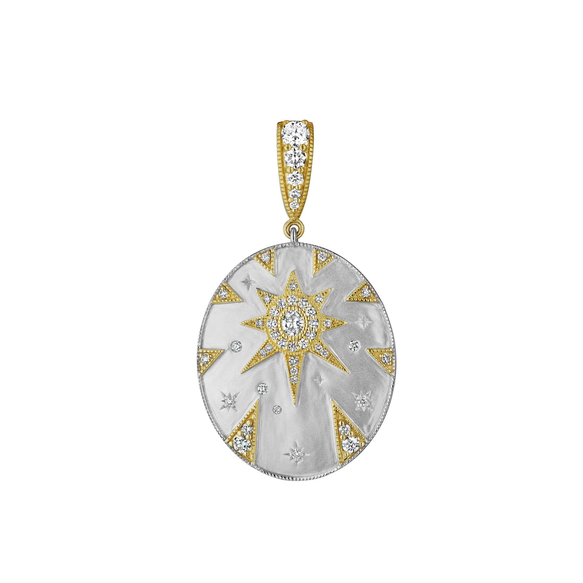 Glowing with divine simplicity, this oval medallion in 18K gold measures 27 x 23 mm and features .64 ct of diamonds that radiate from its celestial center. The balanced shape evokes timeless serenity and cosmic connection.