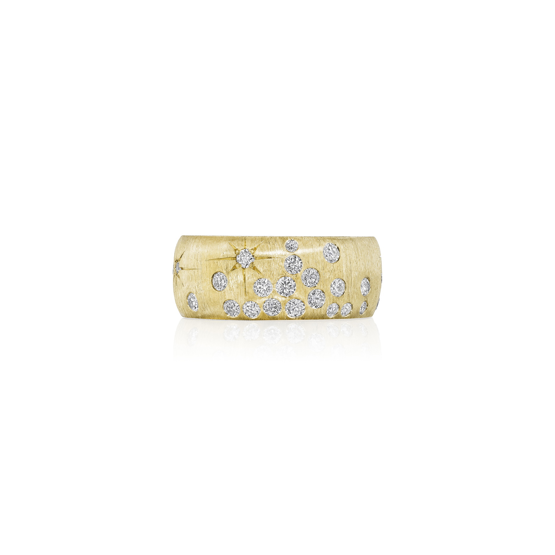 The Wide Galaxy Band evokes the beauty of the night sky in a stunning gold ring. It's crafted with 18K gold and adorned with a total 1.09 carats of round brilliant diamonds to resemble a scatter of stars. This ring set strikes the perfect balance of minimalism and embellishment.