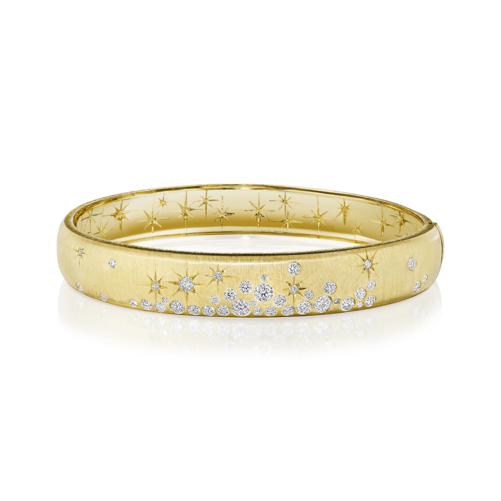 The Wide Galaxy Bracelet evokes the beauty of the night sky in a stunning 10mm gold bangle bracelet. It's crafted with 18K gold and adorned with a total 1.26 carats of round brilliant diamonds that resemble a scatter of stars. This wide gold bangle bracelet strikes the perfect balance of minimalism and embellishment.